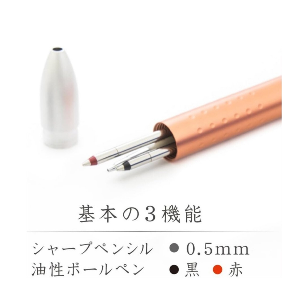 本体重さ14gと軽く、携帯性に優れている商品です。手帳や胸ポケットにすっきりと収まるコンパクトでスタイリッシュなボディ。黒・赤ボールペンと0.5mmのシャープペンシルの3機能を内蔵した多機能ペンなので、忙しいビジネスシーン、学校でノートをとるとき、または普段使いなど様々なシーンで適応してくれます。また、ティアドロップ型の型押しやプラチナプレート加工が機能性と優雅さを演出してます。