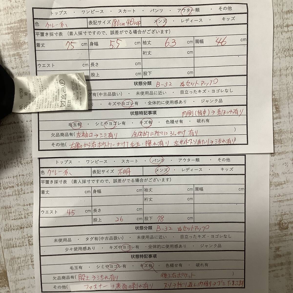 パンツ股上部分に汚れございます。後ろ右ポケットあたりの生地が破れておりますファスナー削れたり塗装剥がれございます。スソの折り返し部分、内側にゴミクズ溜まっております。