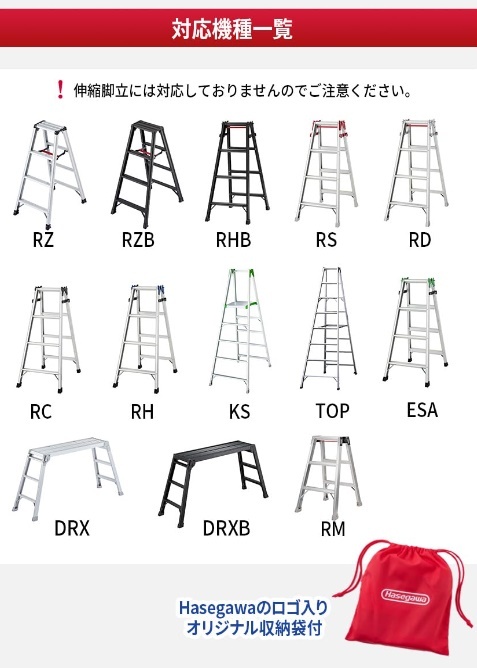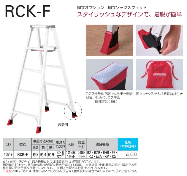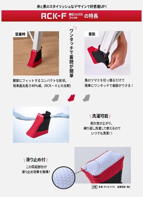 Hasegawa 長谷川工業RCK 脚立ソックス フィットRCK-F■特長・FIT is SMART 時代にフィットするスマートな脚立ソックス・赤と黒のスタイリッシュなデザインで好感度UP・脚部にフィットするコンパクトな形状とツマミを引っ張るだけのワンタッチで簡単に着脱が可能!・耐久性が上がり、繰り返し洗濯して使えます。ロゴ入りのオリジナル収納袋付。