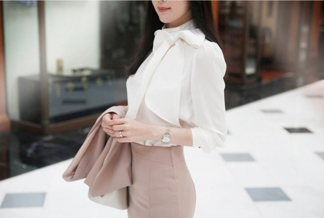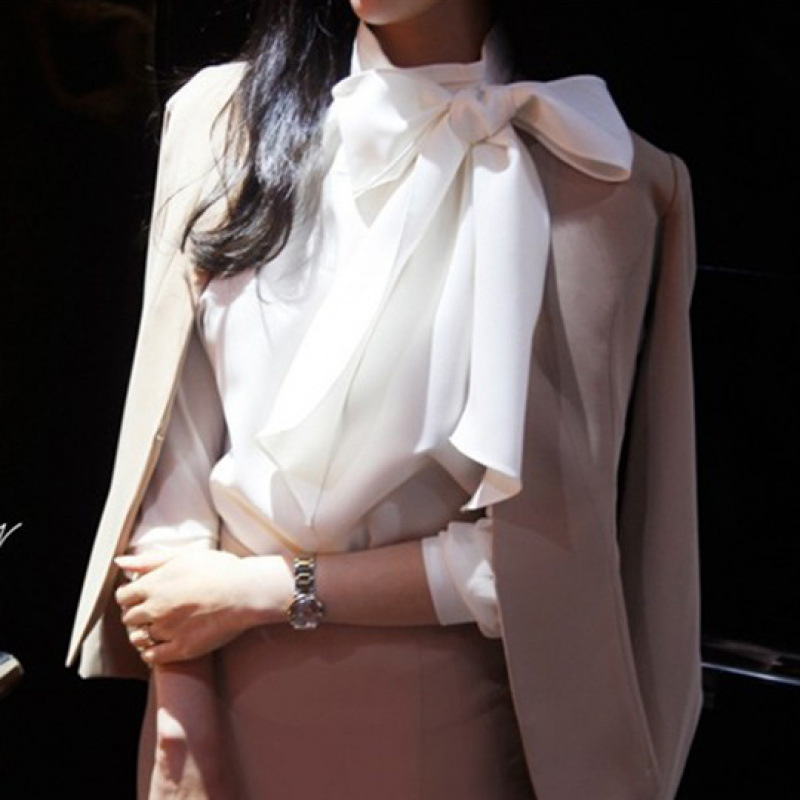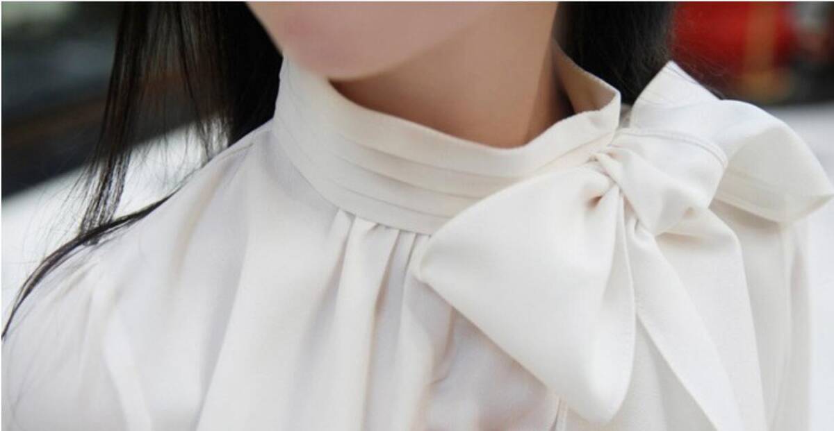 「同梱1万円送料無料」大きなリボンブラウスハイネックボリューム感フェアリーストー ンシャツトップス長袖シフォン無地可愛い格安即納白XL
