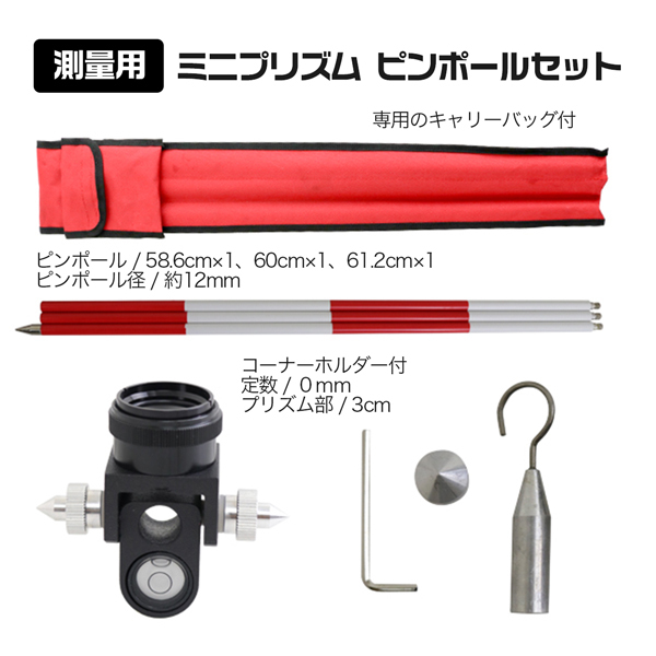 トータルステーションのお供に! ミニプリズム ピンポールセット あればあるだけ便利です まとめ買いはいかがですか? 【商品名】 測量用ミニプリズムセット 【商品番号】 mini-prism 【商品仕様】 定数 0mm ピンポール 58.6cm×1 60cm×1 61.2cm×1 ピンポール径は約12mmです。 コーナーホルダー付 【注意事項】 ※輸入品につき本体に僅かなキズ・サビ汚れなどがつく場合があります。 ※入荷時期により予告無くデザイン・色・サイズなど、細かな仕様が変更される場合がございます。 ※色合いの感じ方には個人差があり、撮影状況・PC環境により色合いが異なる場合がございます。 ※細かい点が気になる方、神経質な方はご注文お控えください。 ご注文前に必ずご確認下さい ⇒お買い物ガイド |