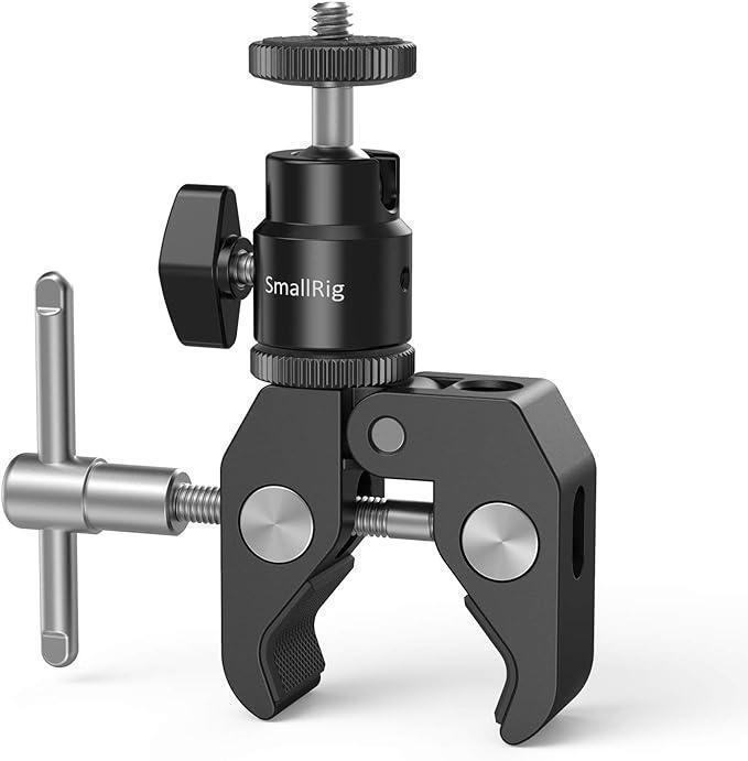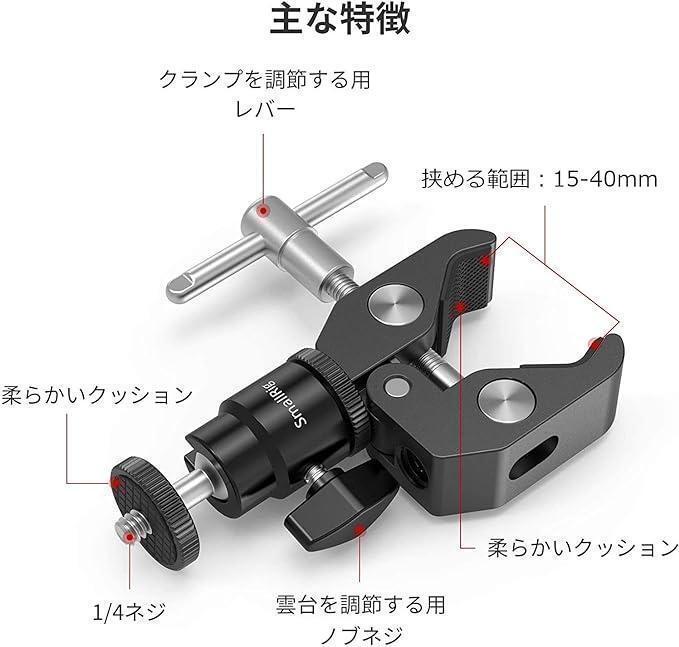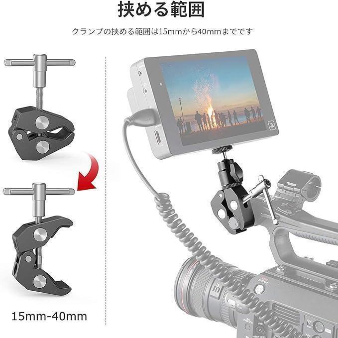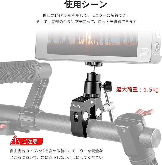 本製品は蟹バサミクランプと1/4インチネジ付きの自由雲台を組み合わせたリグです。本製品を介してモニターやLEDライトなどのカメラアクセサリーを装着できるだけではなく、傘、フック、棚、板ガラス、クロスバーも装着できます。