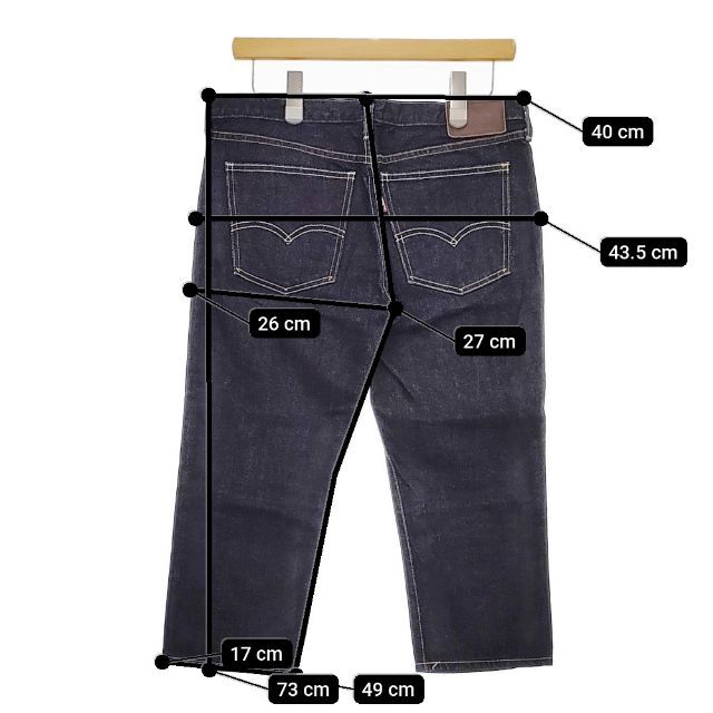 実寸サイズ | 総丈:約73cm ウエスト:約40cm 股上:約27cm 股下:約49cm ヒップ:約43.5cm ワタリ幅:約26cm 裾幅:約17cm ※記載以外のサイズが合わないことを理由とした返品はできませんので、 記載部分以外で実寸サイズの気になる箇所があれば必ず購入前にご質問ください。 |