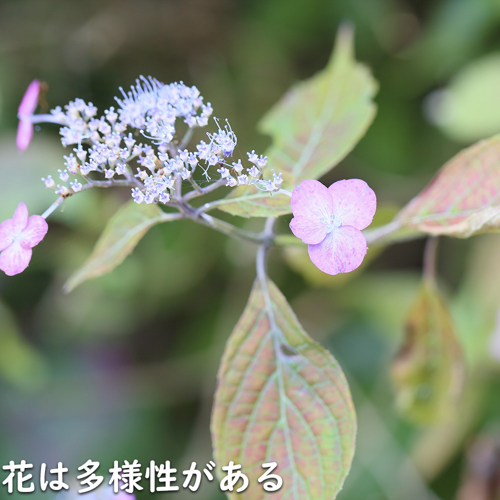 ヤマアジサイは普通花の周りに装飾花が咲くのが特徴です。広葉樹林の谷筋などに生育します。素朴な雰囲気です。