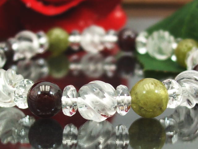 \\嬉しい送料無料// ====== 石の意味 ====== 1月誕生石♪ ガーネットは情熱の石 十字軍の兵士達がお守りとして 身に付けていた事より 持ち主に永遠の忠誠を誓い 守り、願いを叶えるとされます グリーンガーネットは グリーングロッシラーとも呼ばれます。 嫌悪感を失くし 対人関係をスムーズにするとされます 水晶は命が宿るとされ珍重されます 邪悪なものを浄化し寄せ付けず 幸運を呼び込むとされます 他の石と組み合わせると メインの石のパワーを 増幅する効果も♪