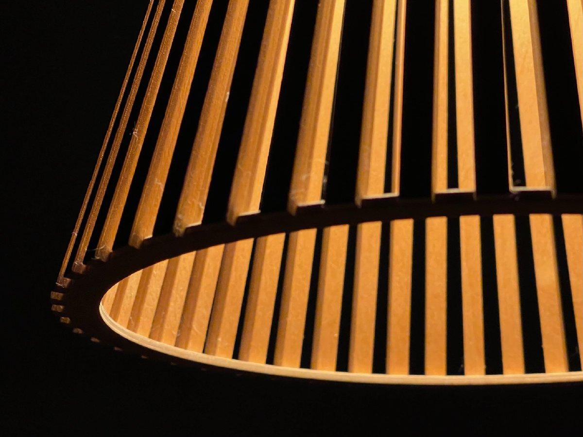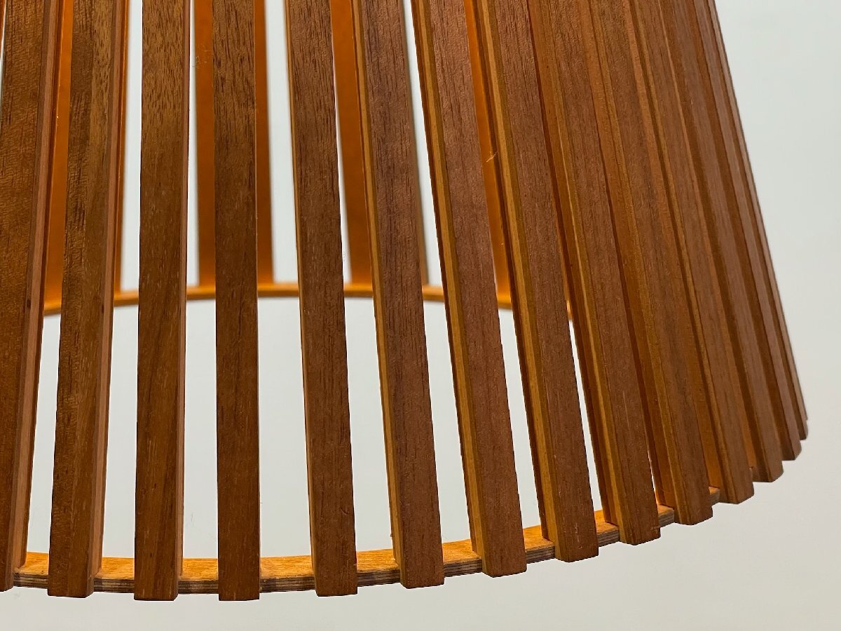 最高品質のバーチ材を並べて構成した独特なフォルムのシェードは、光を受ける内側と光を切り取る外側で異なるコントラストと陰影を生みながら、大ぶりなサイジングながら軽快なデザイン。