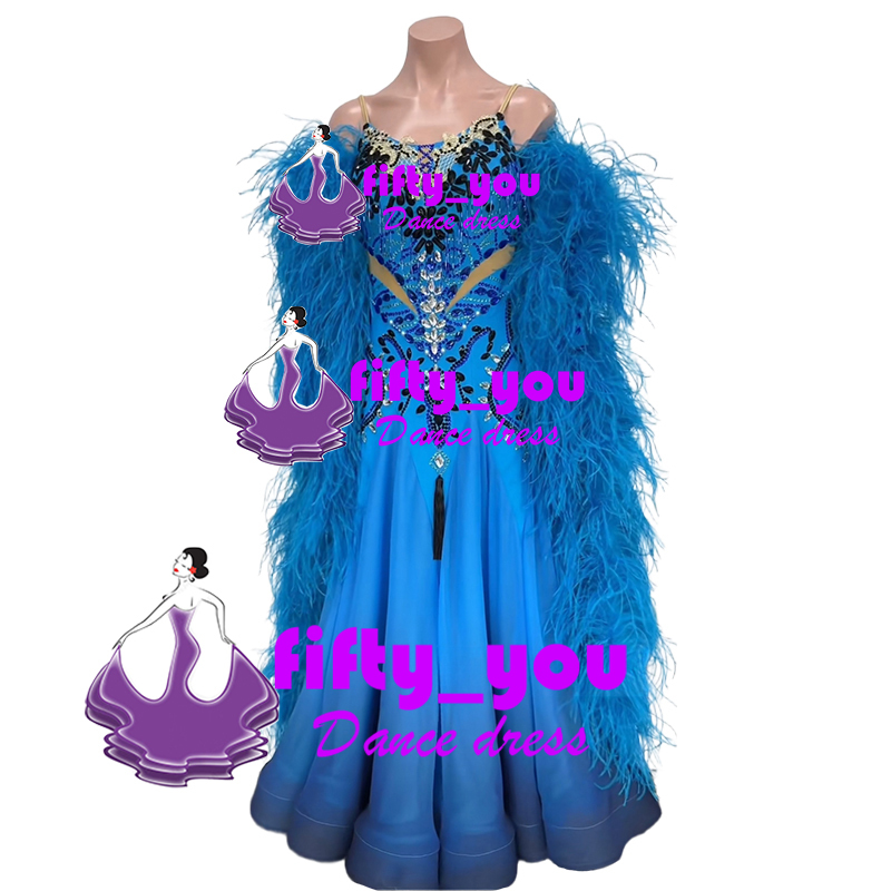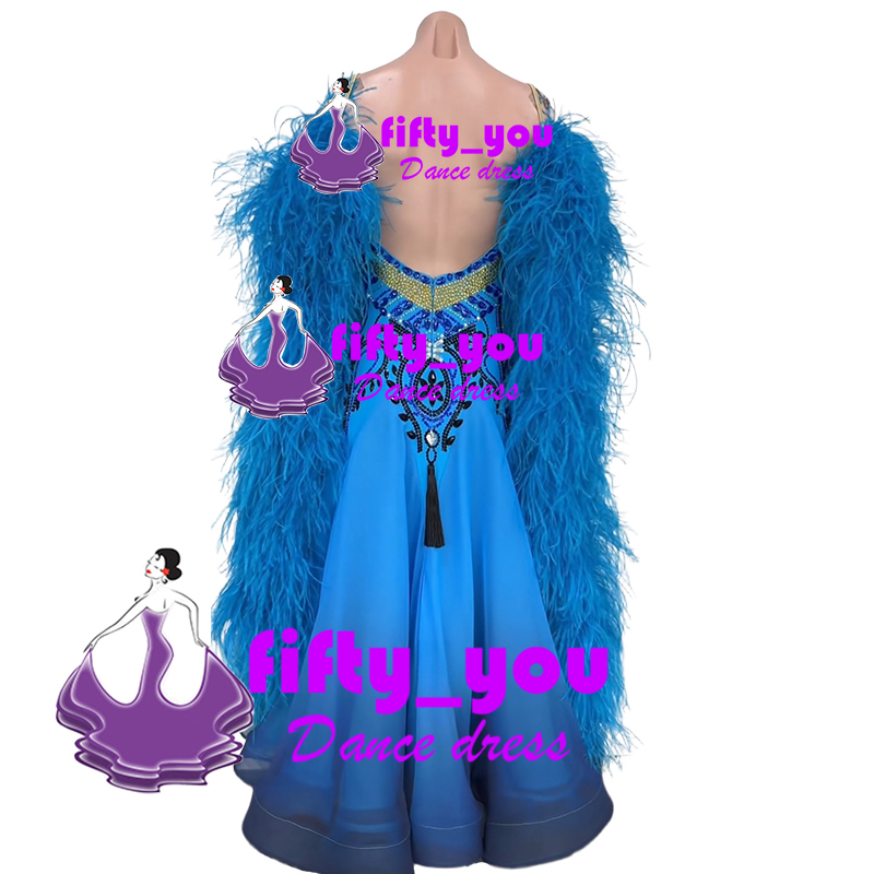 新品fifty_you レディース社交ダンス衣装 競技ドレス セミオーダー スタンダードドレス ボリューム羽フロート グラデーションスカート
