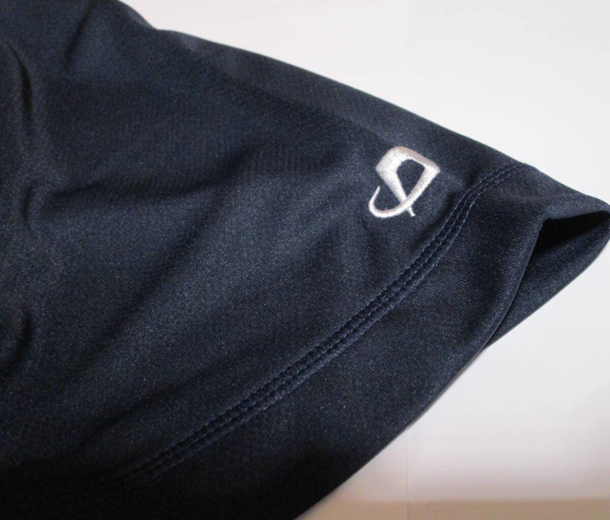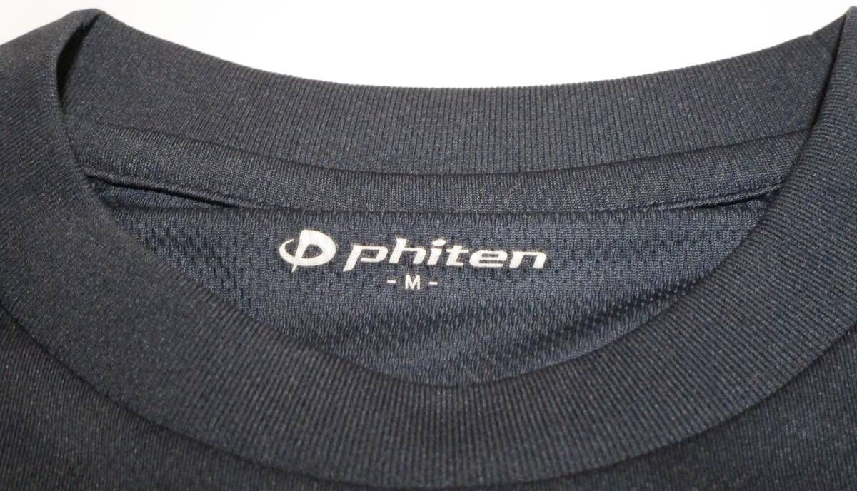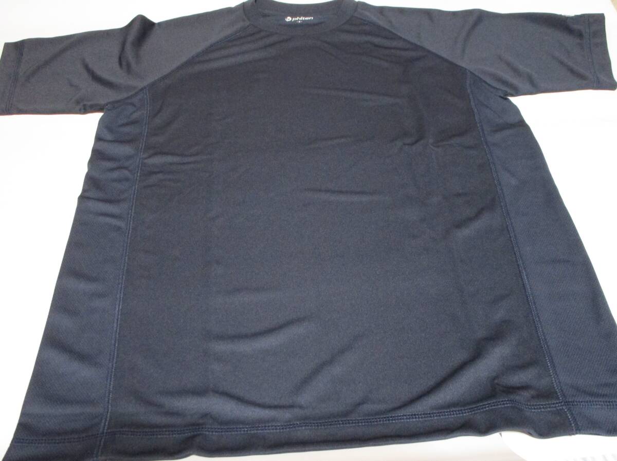 ファイテンRAKUシャツSPORTS(吸汗速乾)、半袖、Mサイズ(胸囲88〜96cm、身長165〜175cm)、色はネイビー、素材はポリエステル100%です。
