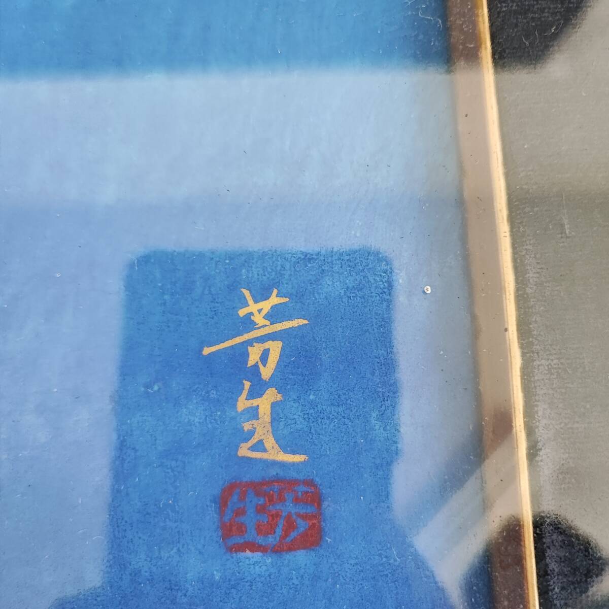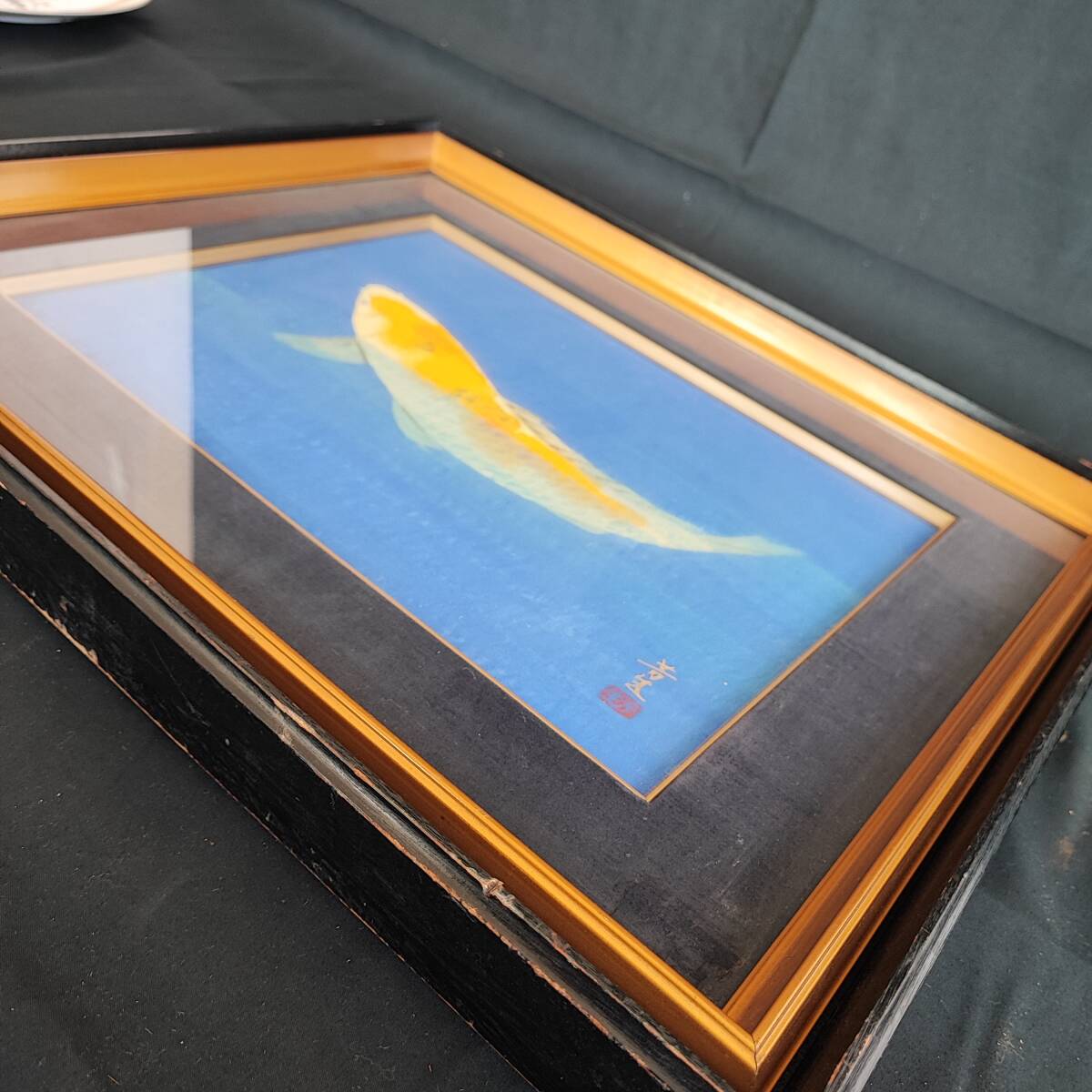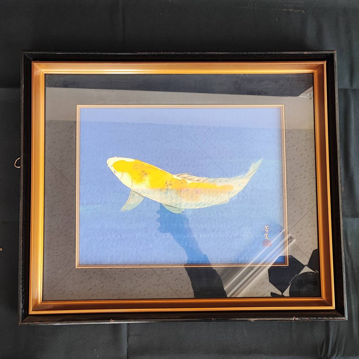 本商品は、青い背景に金色の錦鯉が描かれた額装アート作品です。作品の右下には「音生」と思われるサインと朱印が記されており、和風の美を感じる一枚となっています。