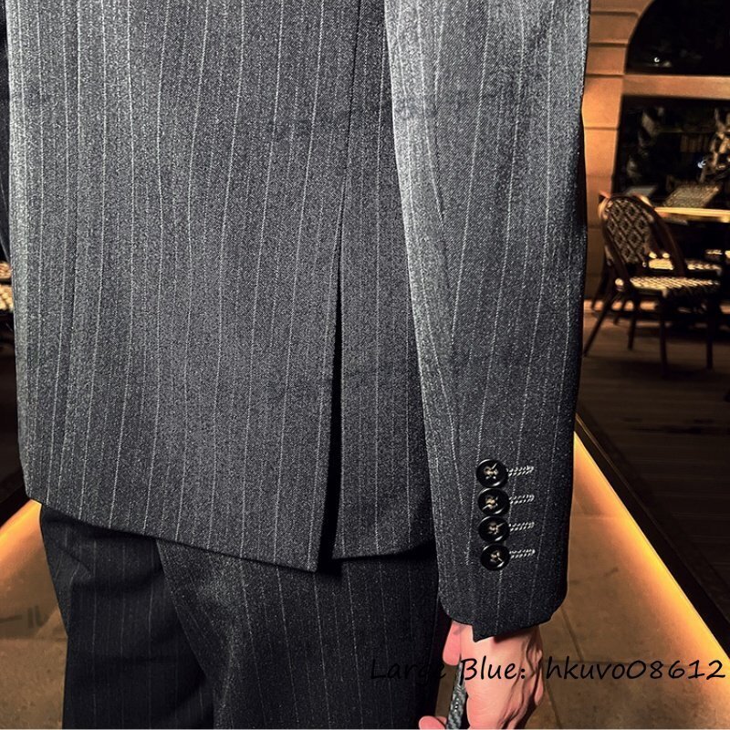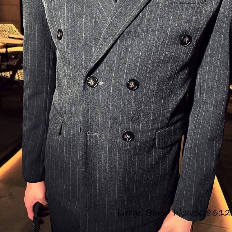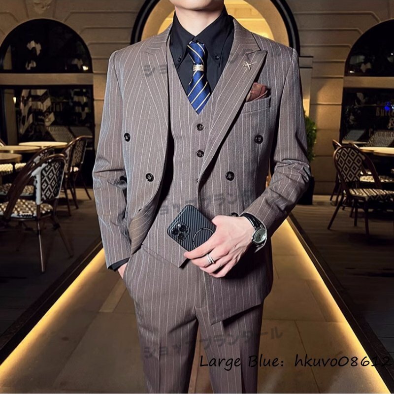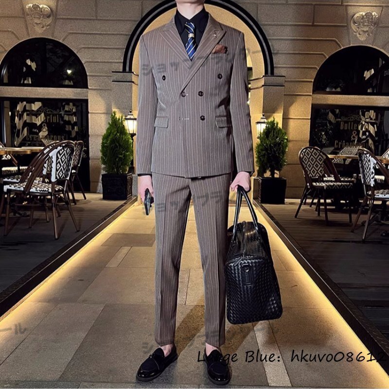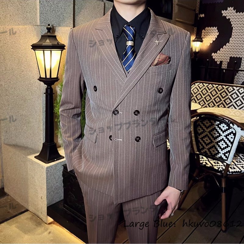 スリーピース メンズ ストライプ柄 ダブルスーツ スーツセット スタイリッシュ 背広 二つボタン 紳士服 結婚式 珈琲色 4XL