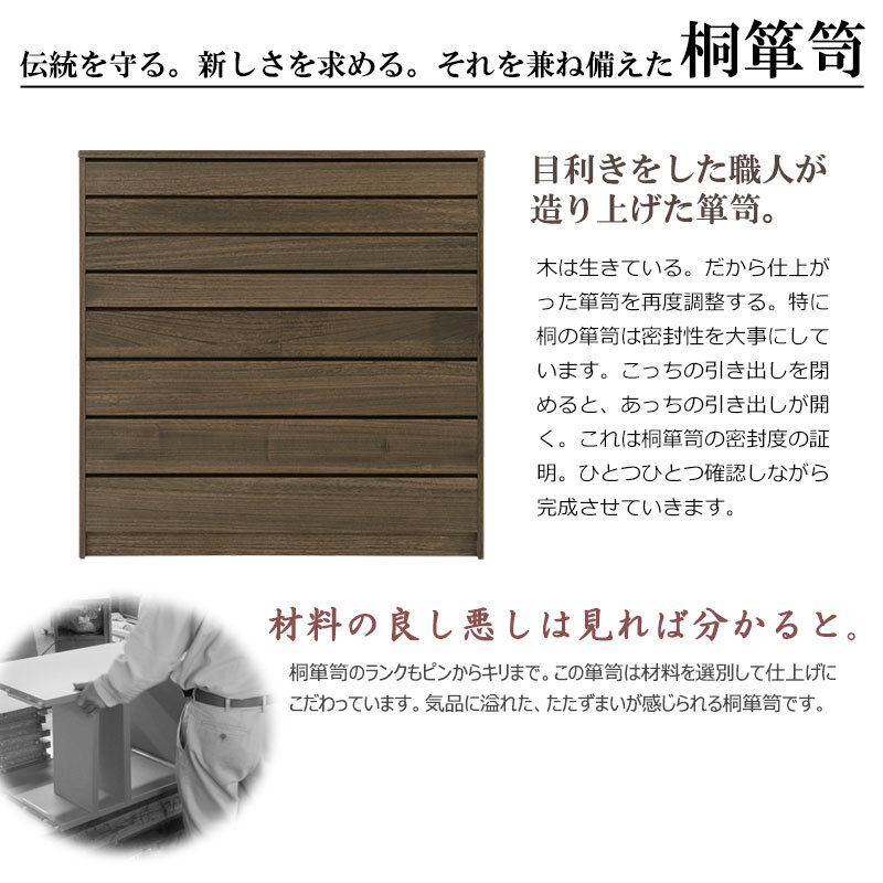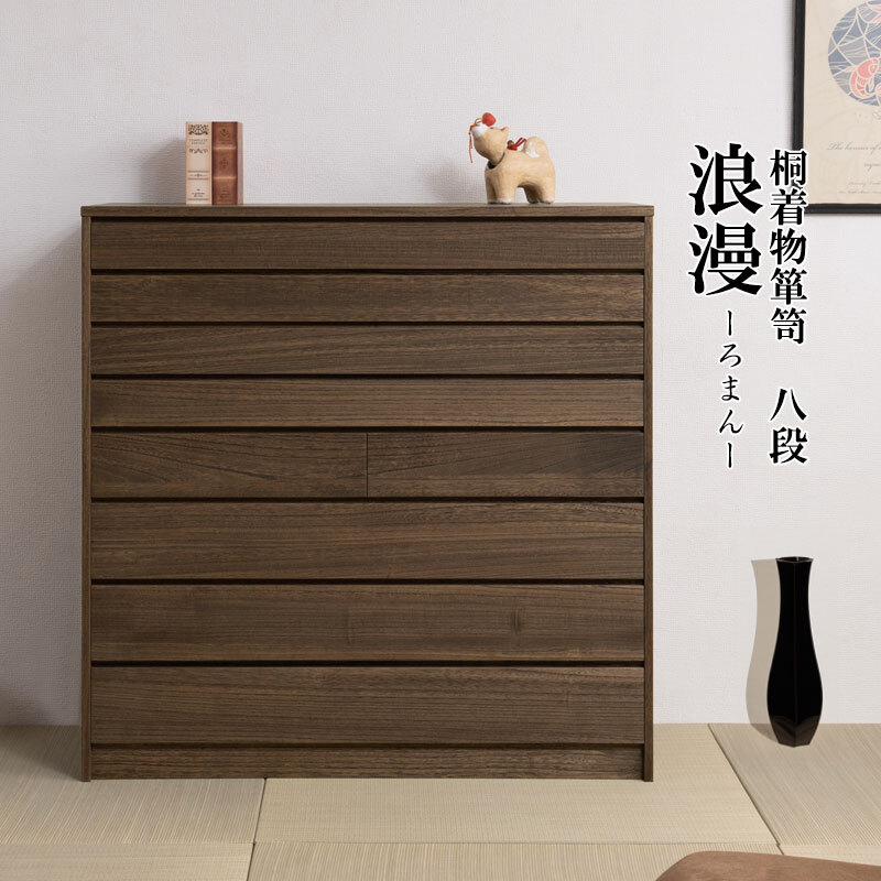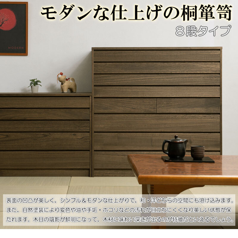 ■商品について/現代のデザイン性と伝統業を落とし込んだ桐モダン箪笥【Roman】浪漫シリーズ。表面の木目の固い部分だけを浮き彫り状に残す浮造り仕上げで木目に沿った凹凸を再現し、天然木ならではの美しさをより際立たせると共に、自然塗装により自然感、素材感を最大限に演出しております。金物取っ手を排除した本当の素材の良さを全面に生かしたモダンな印象。5段・8段をラインナップ。桐材は内部を一定の湿度に保とうとする働きがあるので大事な着物や洋服などを湿気から守る桐箪笥にしまうのがベスト。味のある仕上げとキレイに並んだ引出しのラインとの調和が魅力。