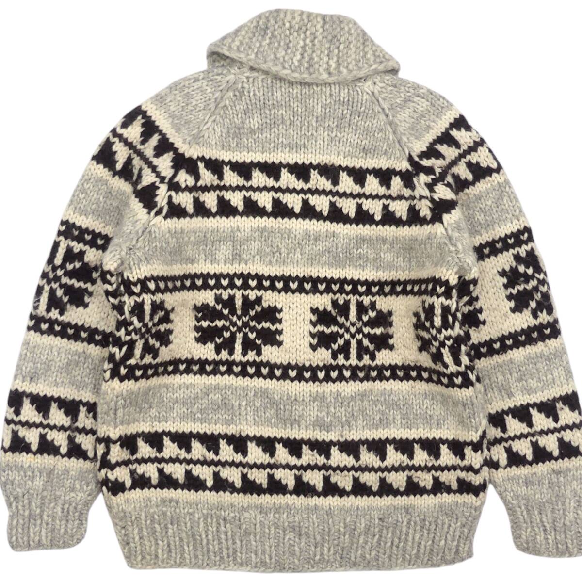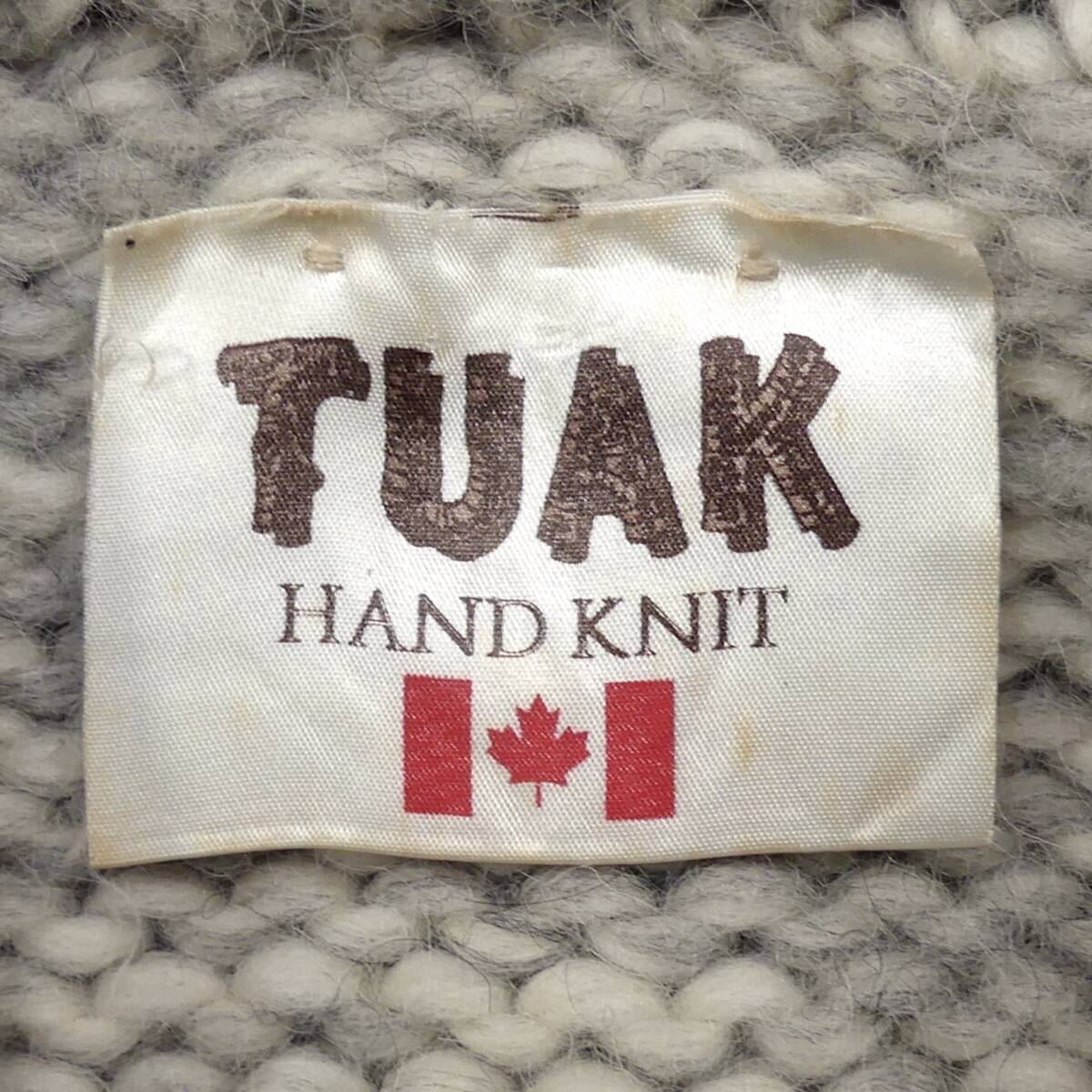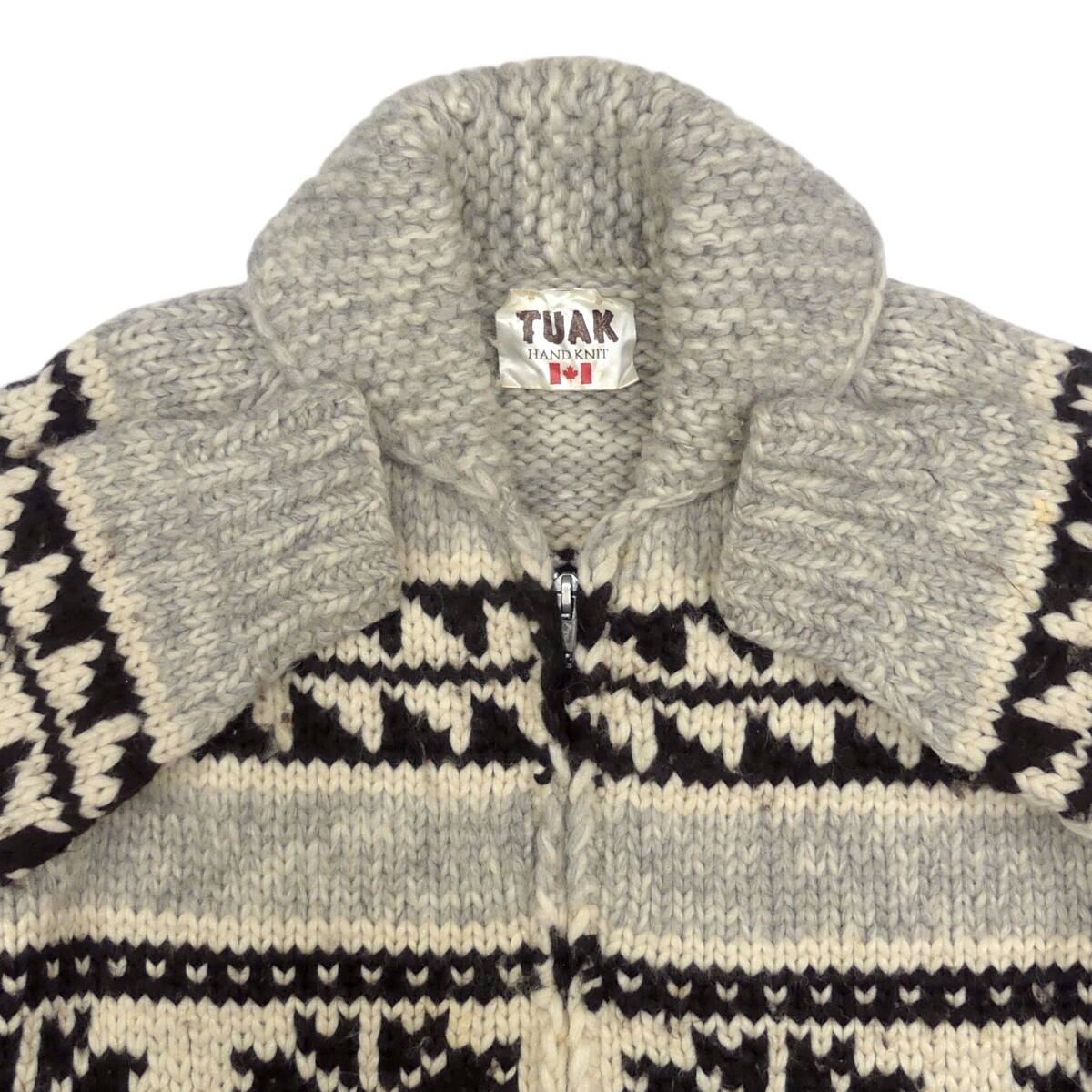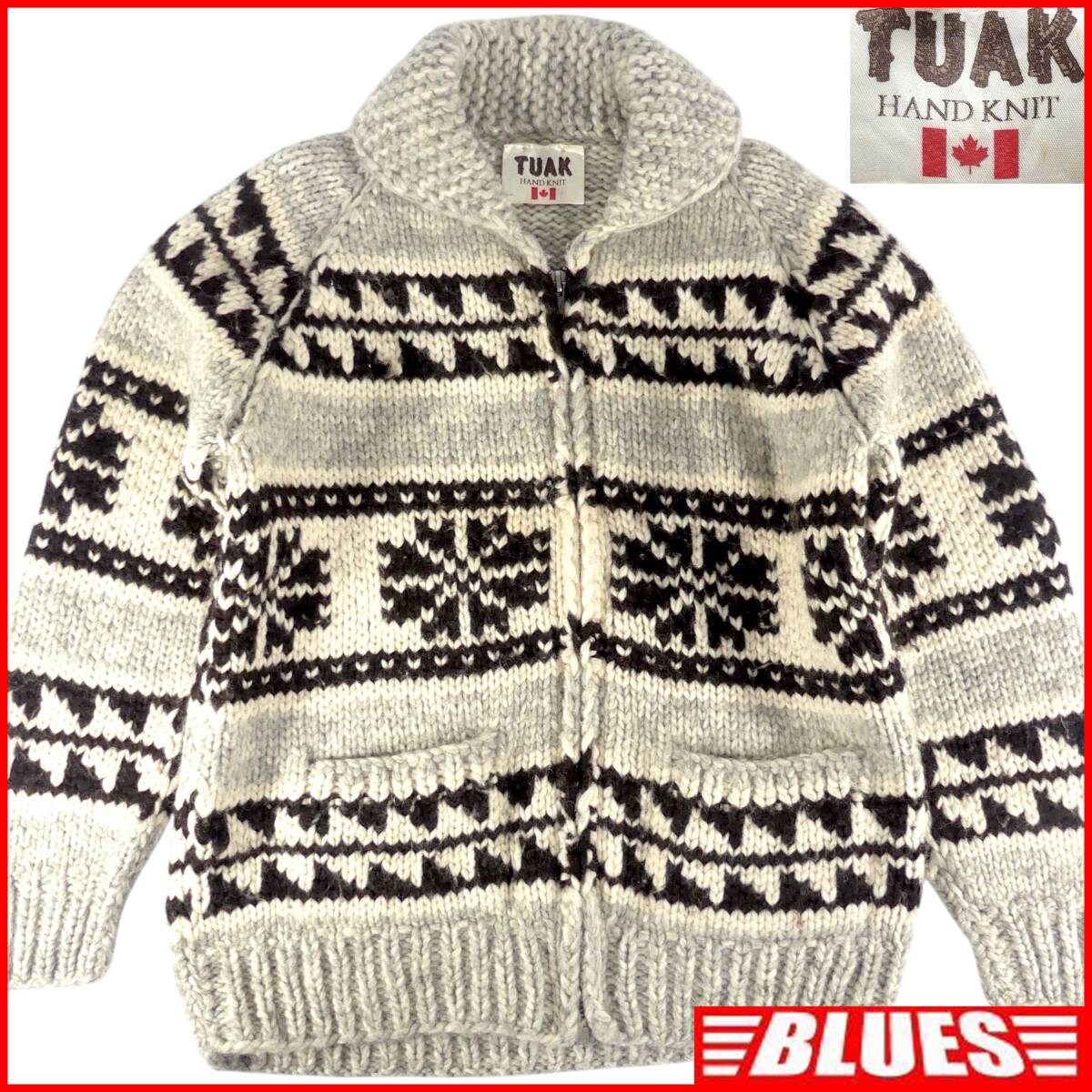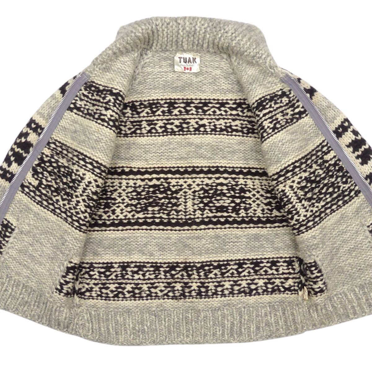 即決★カナダ製 TUAK★メンズ XL カウチンセーター トゥアック グレー 雪柄 ウール ハンドニット セーター カーディガン ジップアップ