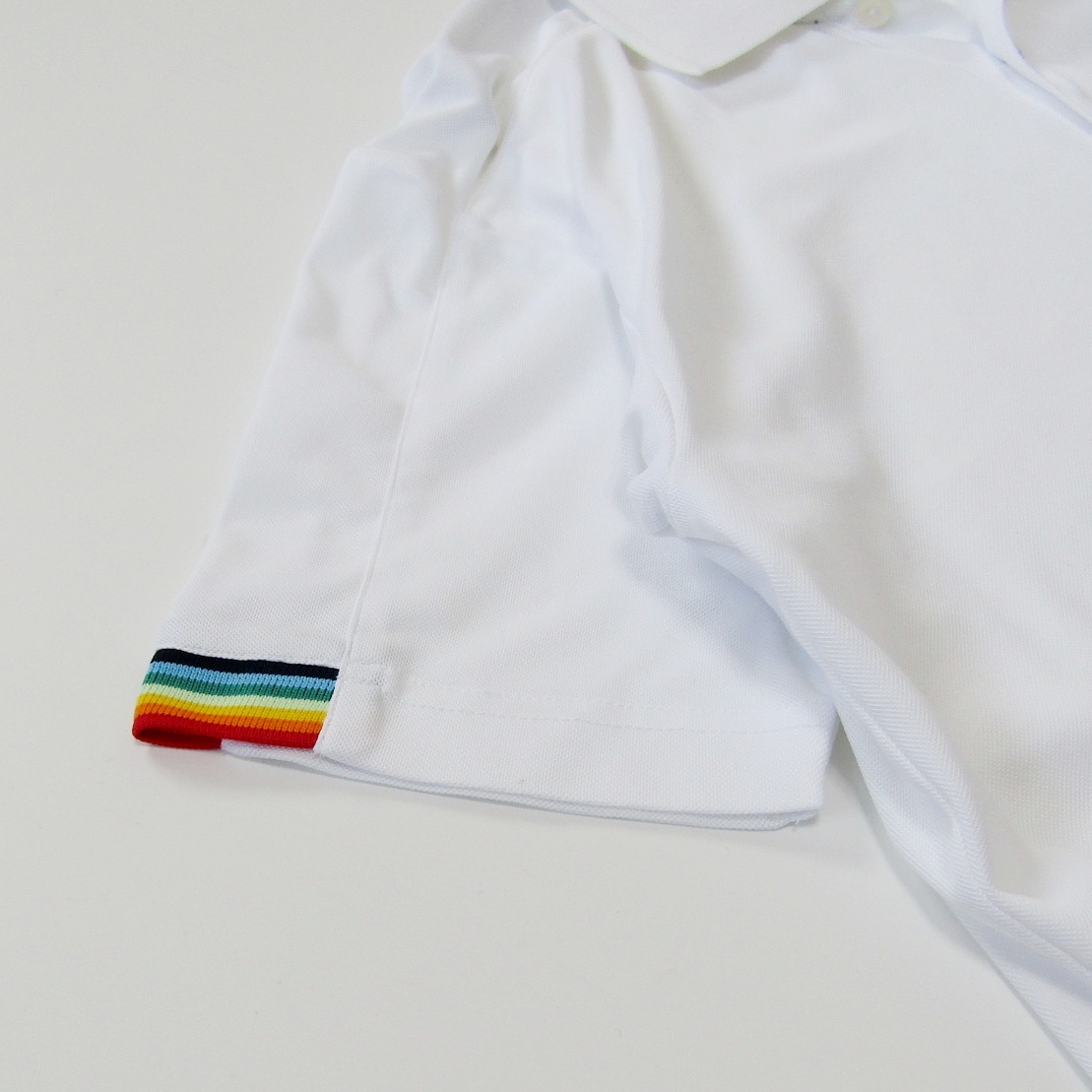 ホワイトのPARADISO製ゴルフシャツ、Mサイズ、カラフルなストライプの襟付き。