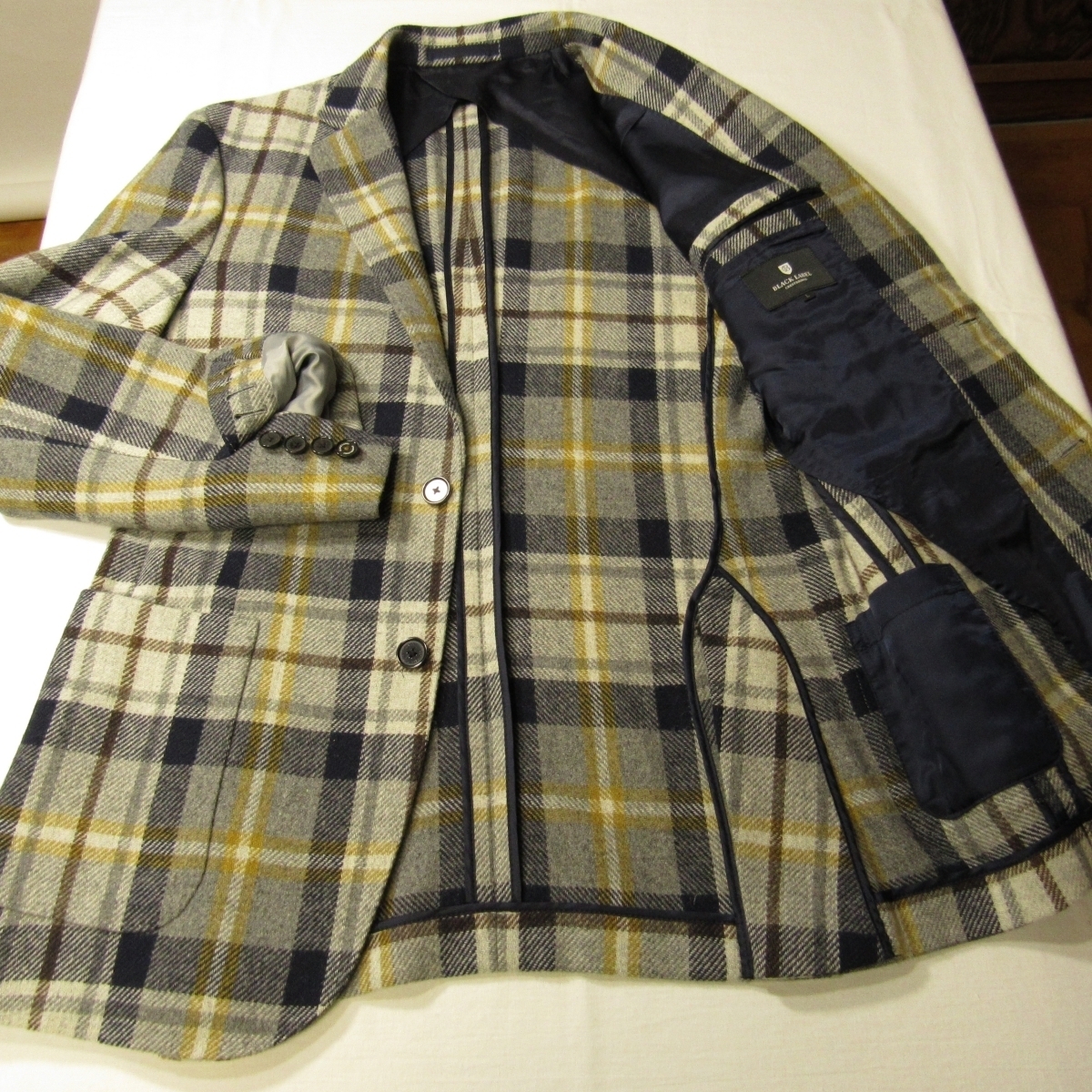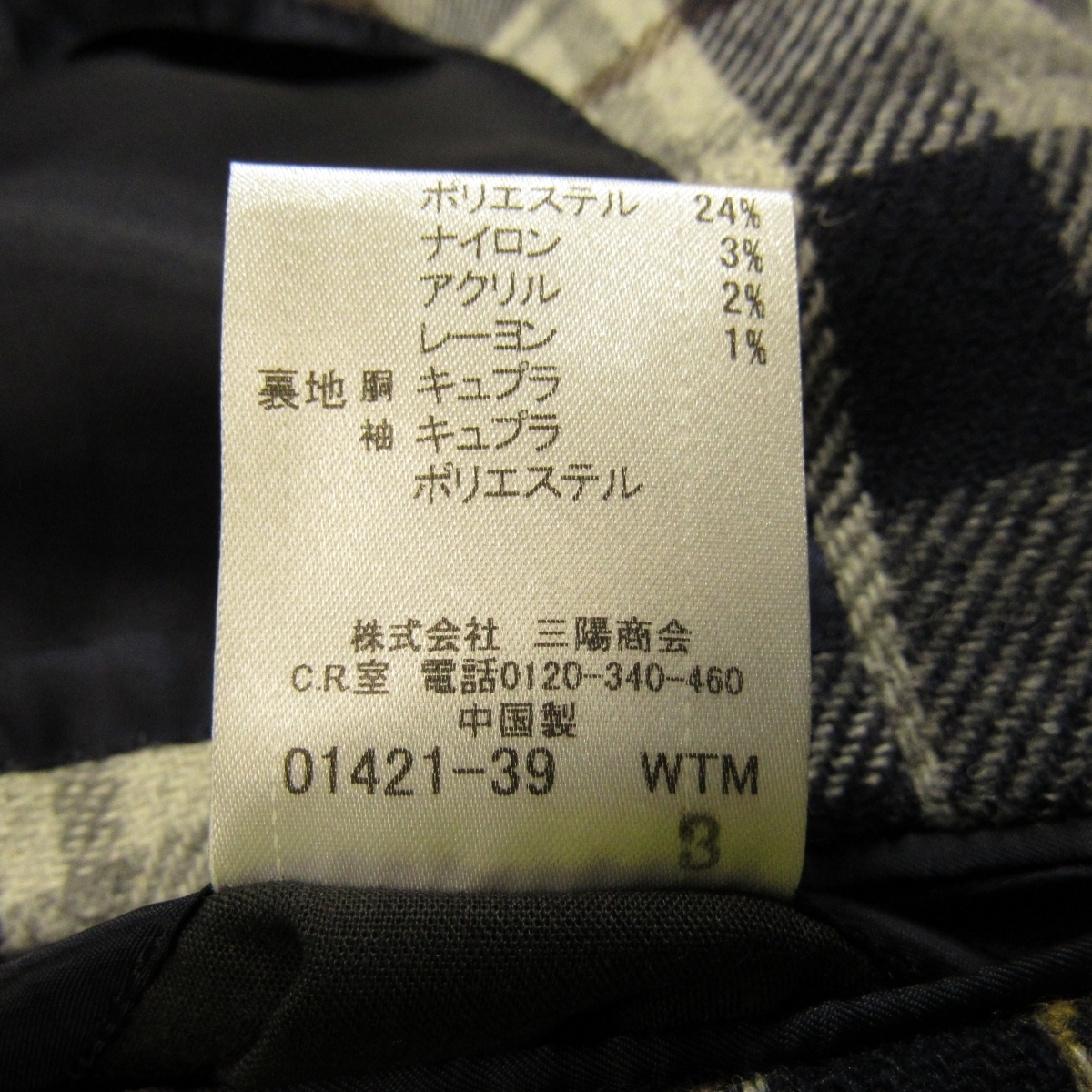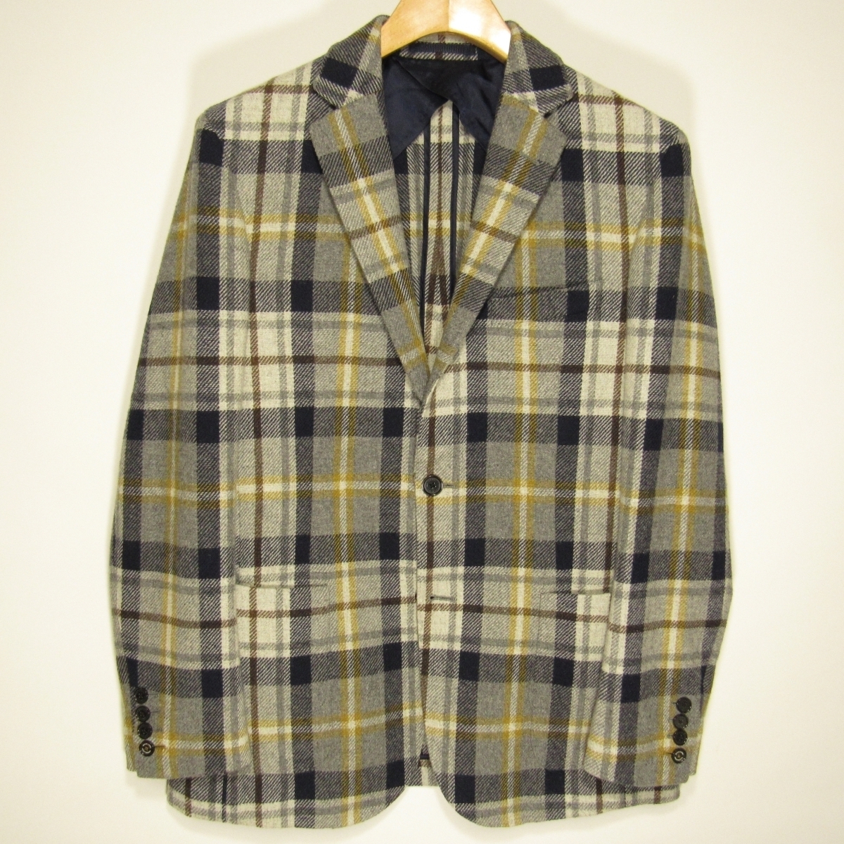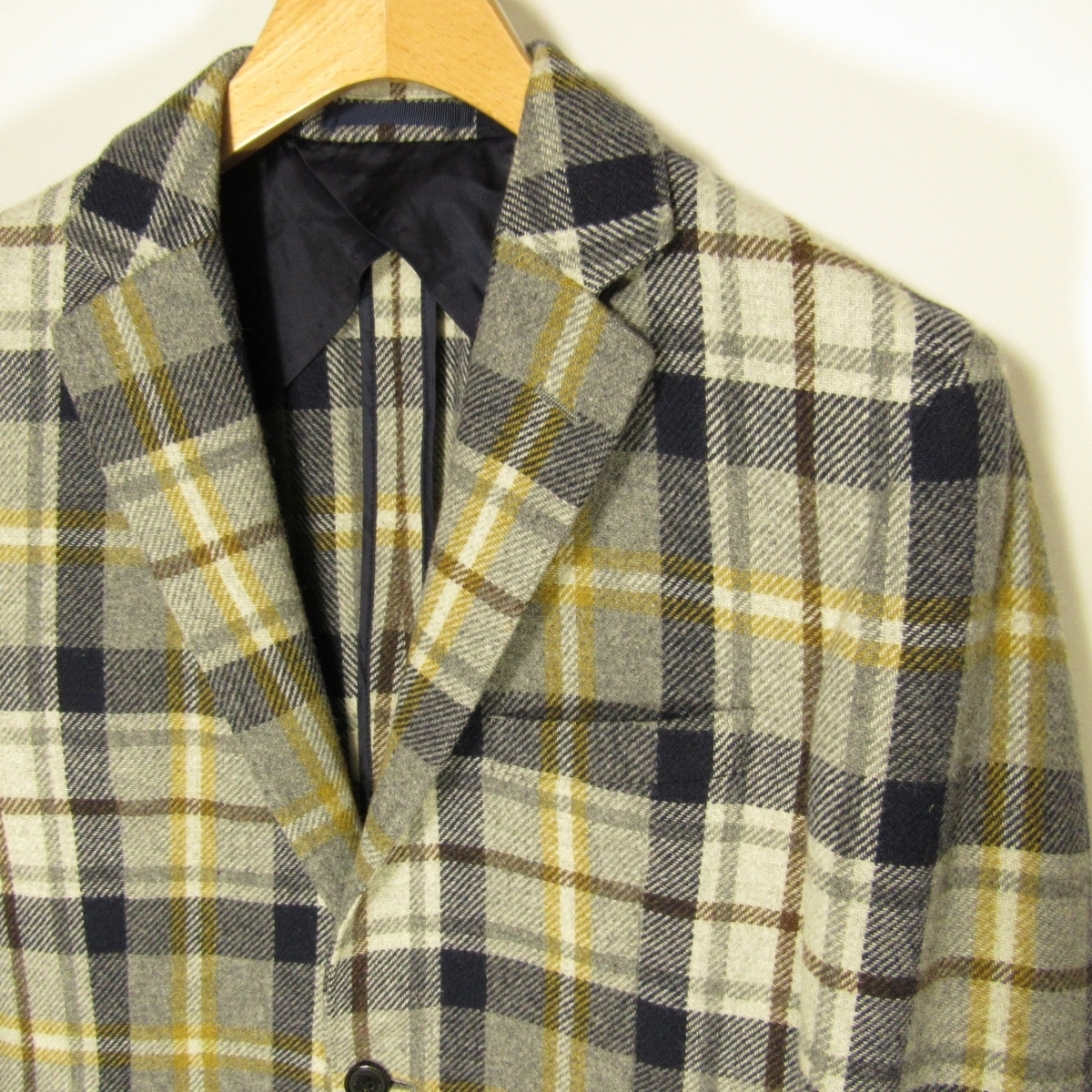 表地-毛70% ポリエステル24% ナイロン3% アクリル2% レーヨン1% / 胴裏地-キュプラ / 袖裏地-キュプラ・ポリエステル グレー×ネイビー×マスタード×オフホワイト×ブラウン / チェック柄 |