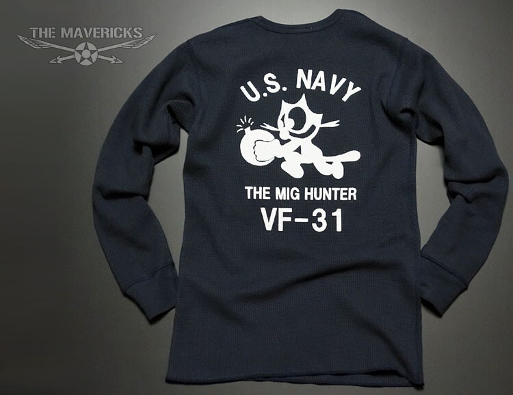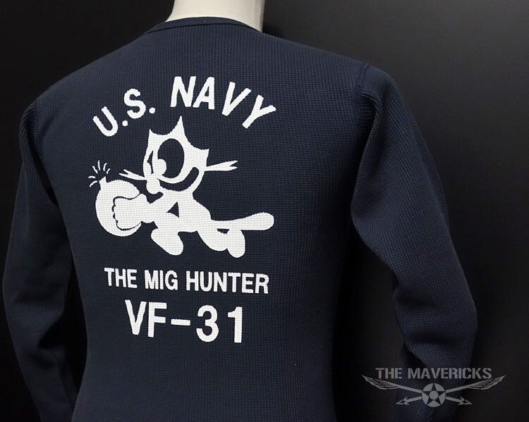 前面左胸にはステンシルデザインで 「USN」マーク、背面には爆弾キャット&航空隊VF-31・MIG.HUNTERのロゴが入ったモデル。