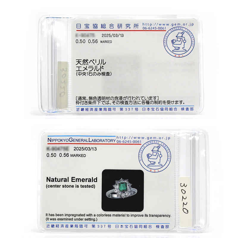 ソーティング記載 | 天然ベリル エメラルド (中央1石のみ検査) 通常、無色透明材の含浸が行われています |