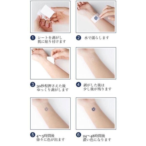■お好きな箇所に貼ることができます。貼り付けたいタトゥーシールを切り取り、表面の透明保護シートを剥がし貼り付けたい箇所の汗や油分と取り除き、絵柄を肌面に触れるように台紙ごとタトゥーシールをのせて軽く押し付けます。30秒ほど待ちます。台紙をゆっくり剥がしていき乾けば完成です。