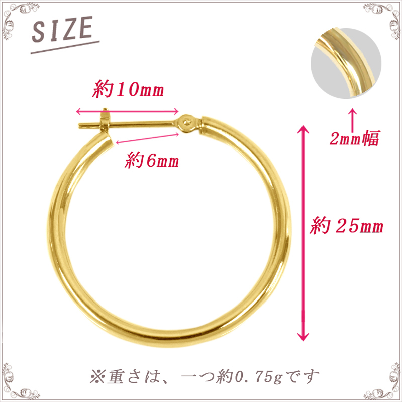 | サイズ | フープ 約 2 × 25 mm ポスト 約 10 × 0.8 mm(20G) 耳に通す部分 約 6 mm 重量 0.75g(1つ) |