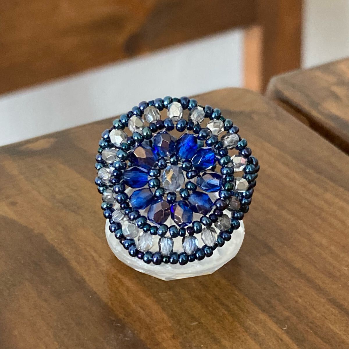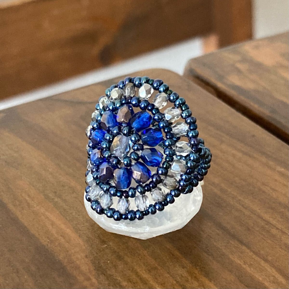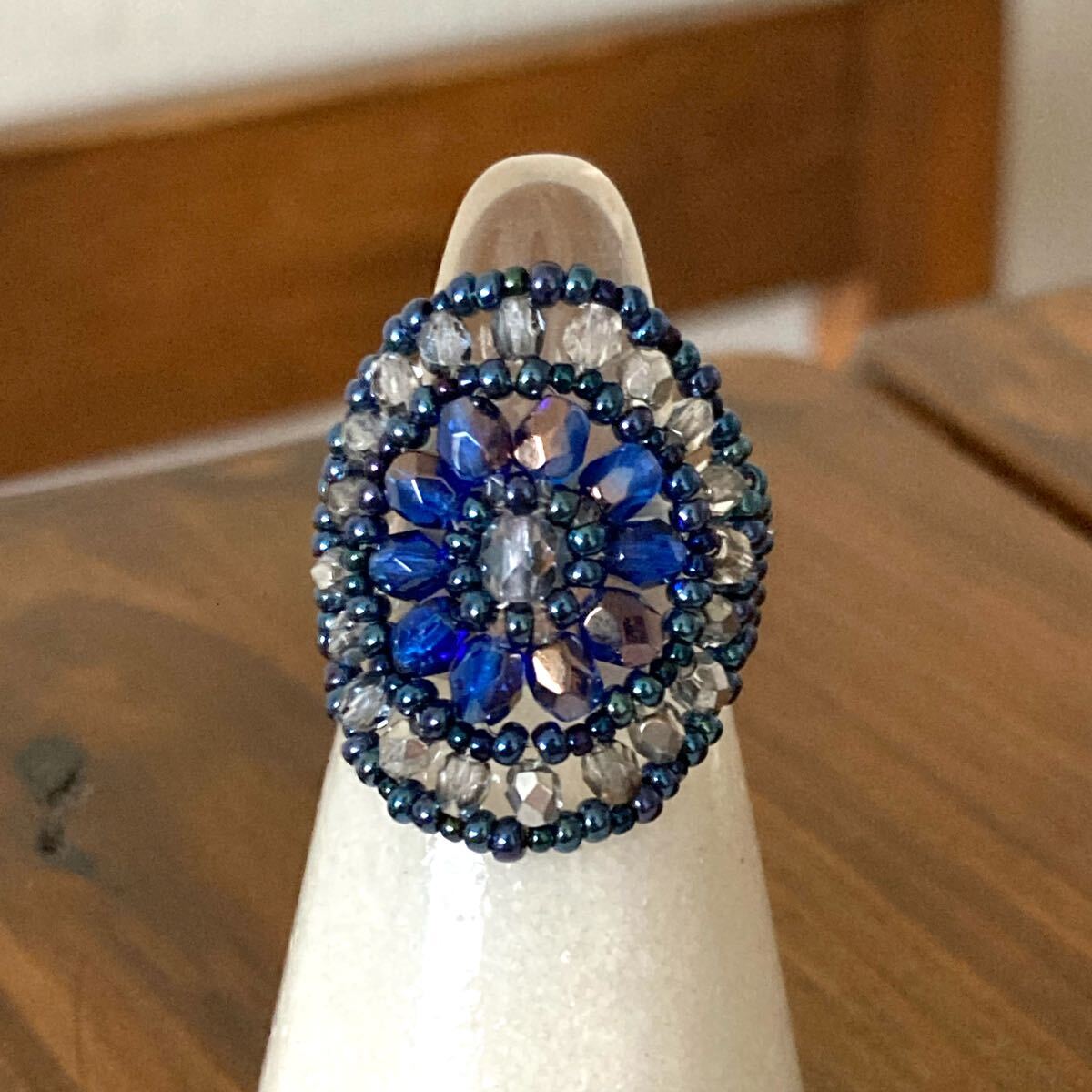 ビーズ  リング  指輪  ハンドメイド 大きい丸型 ブルー×グレーシルバー 17-19号です。
