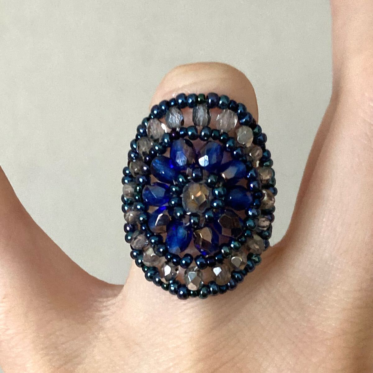 4mmのブルーにブラウン加工のチェコビーズ、3mmのクリアグレーに半分シルバー加工のチェコビーズ、メタリックブルーの丸小ビーズ等で作ったリングです。