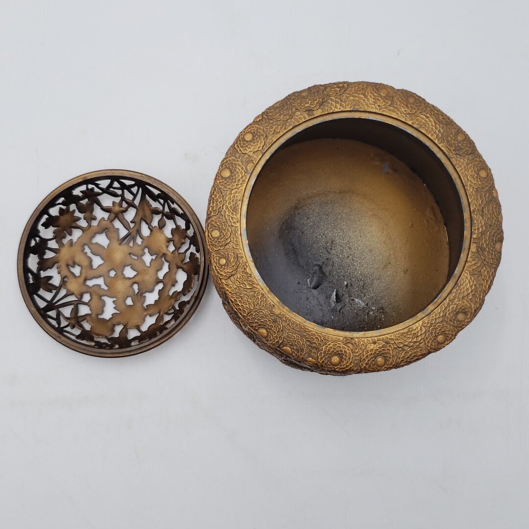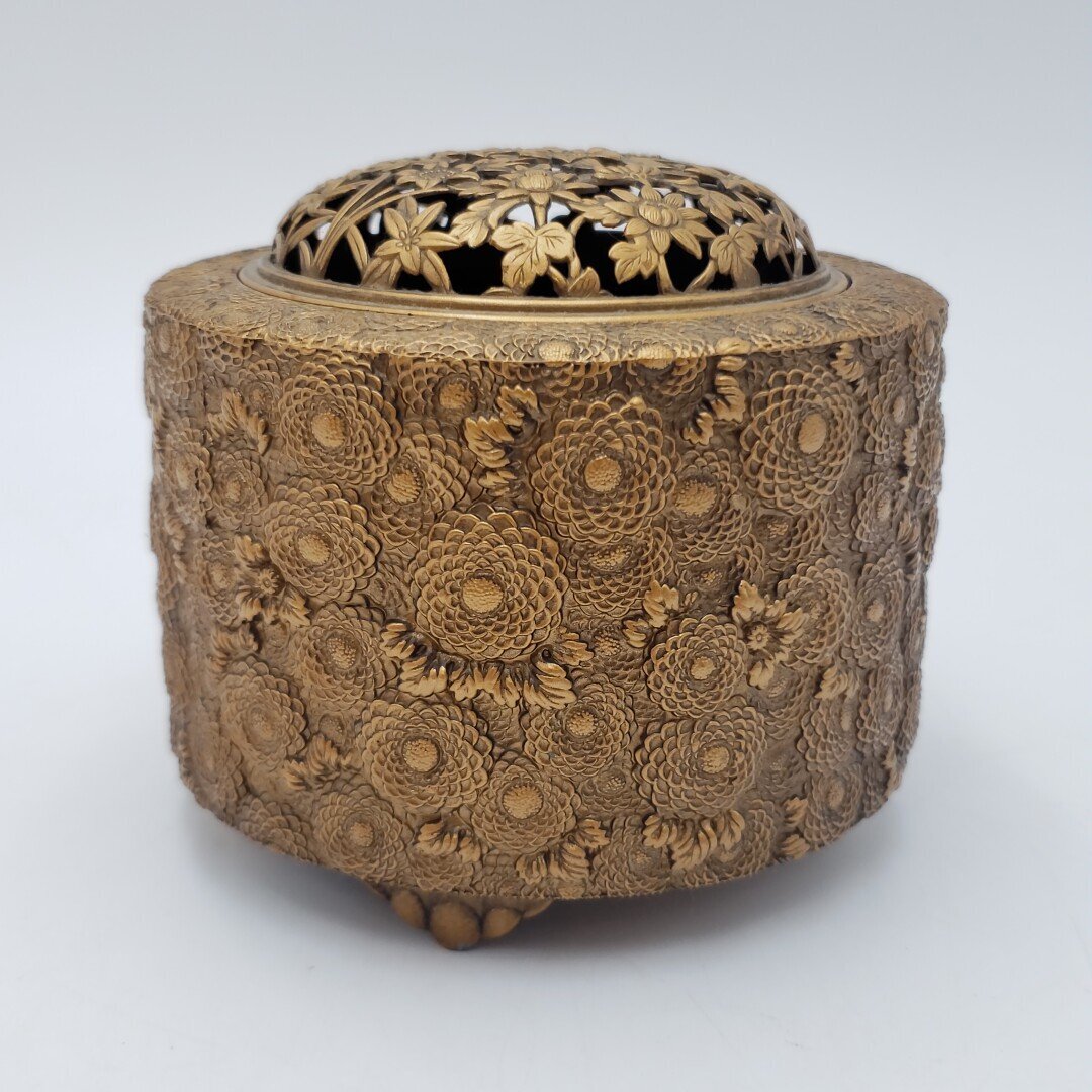 菊華の細かな模様が綺麗な金属製の香炉です。