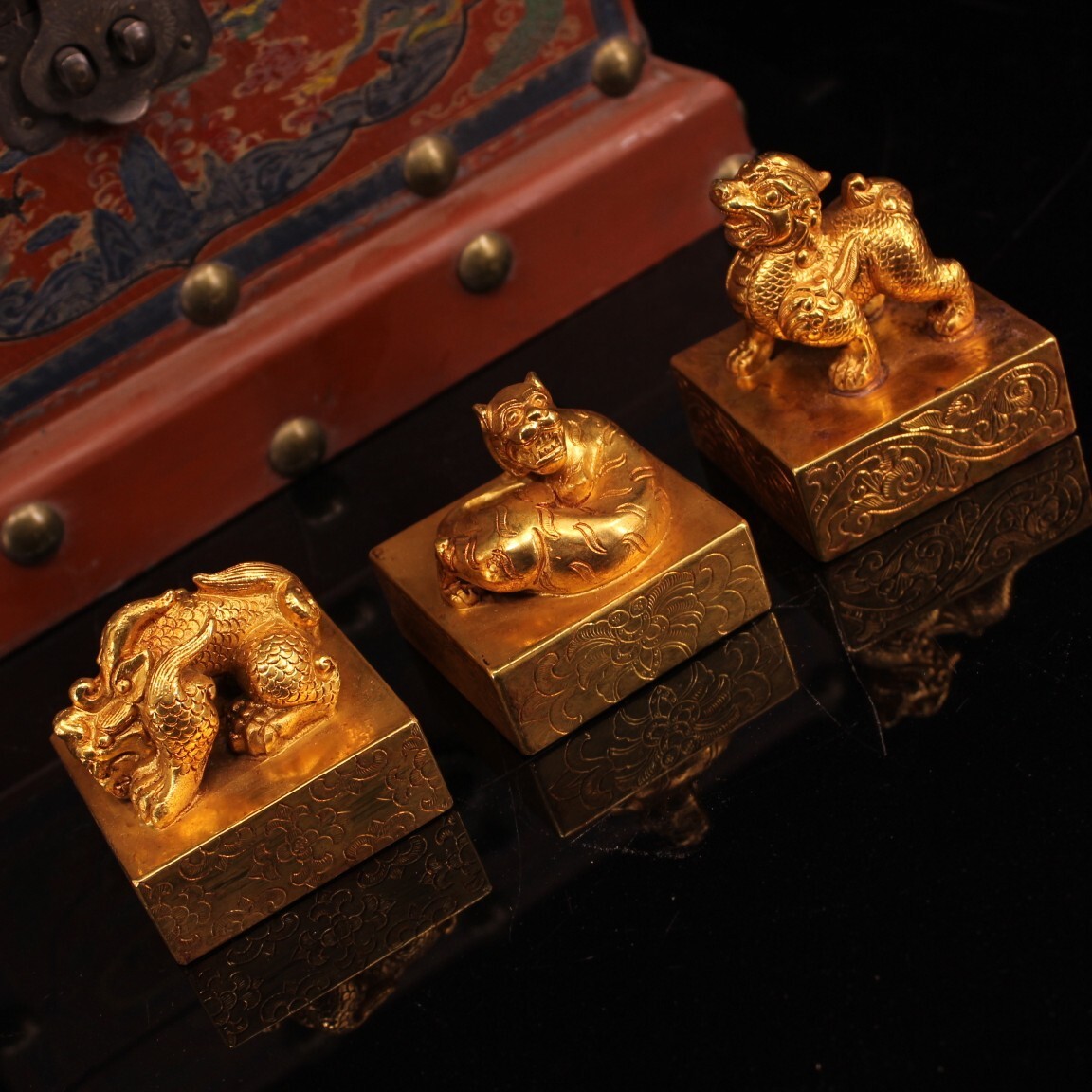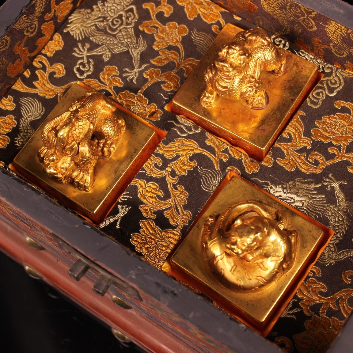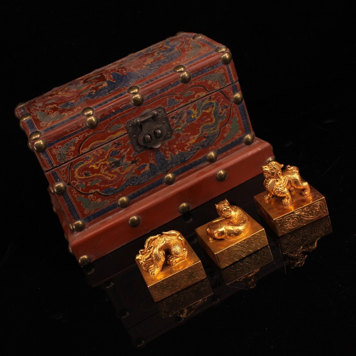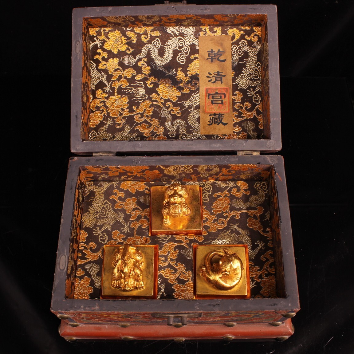 永し 清時代 古銅塗金 乾清宮藏 瑞獸鈕 印章 三點 文房具 漆盒 極細工 古銅彫 置物擺件 古美術品 時代物 古董品 収集 旧家蔵出 中国唐物 A6