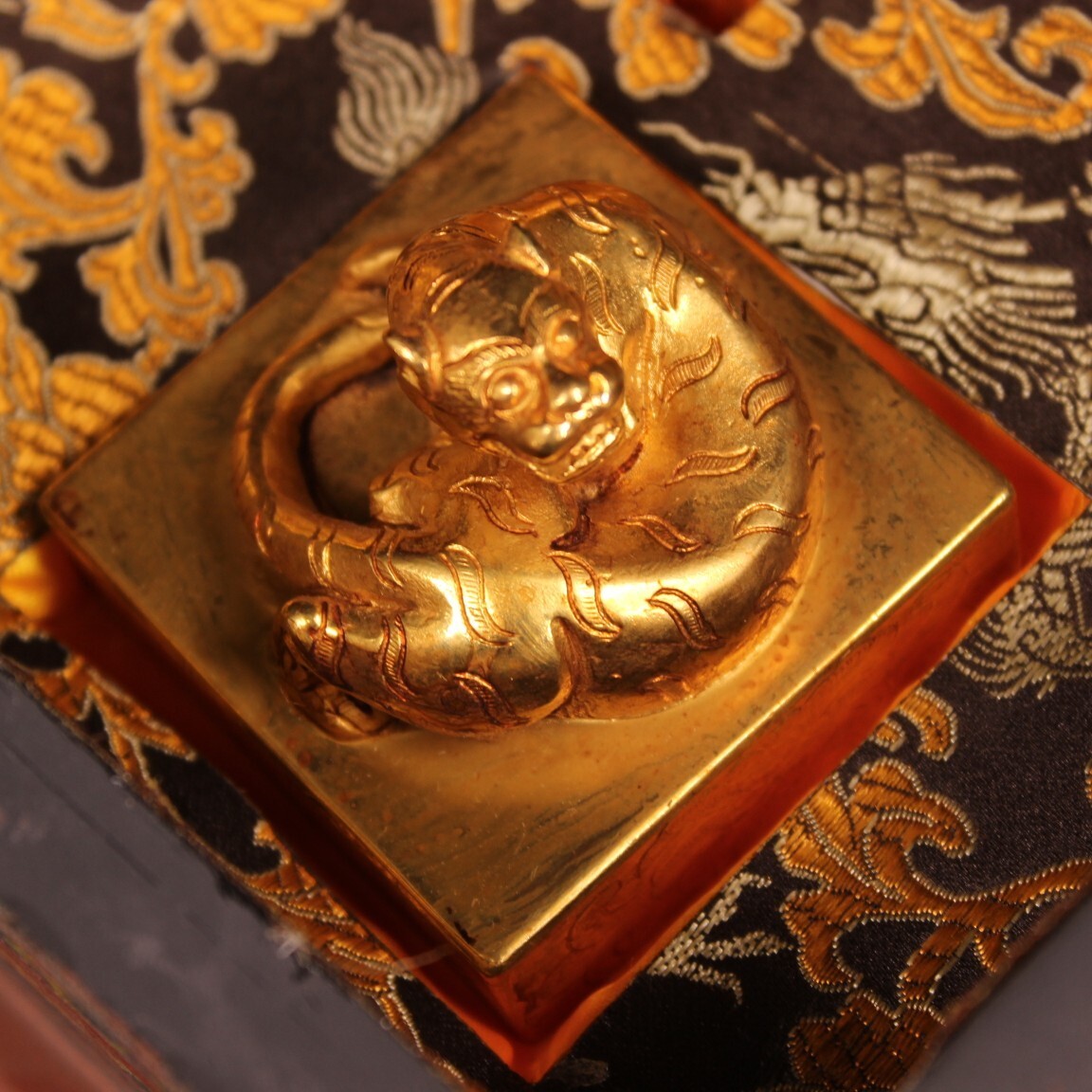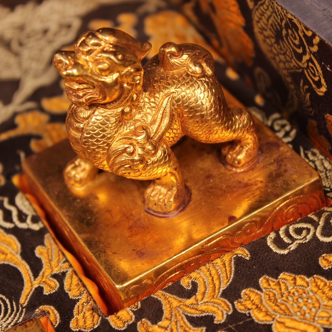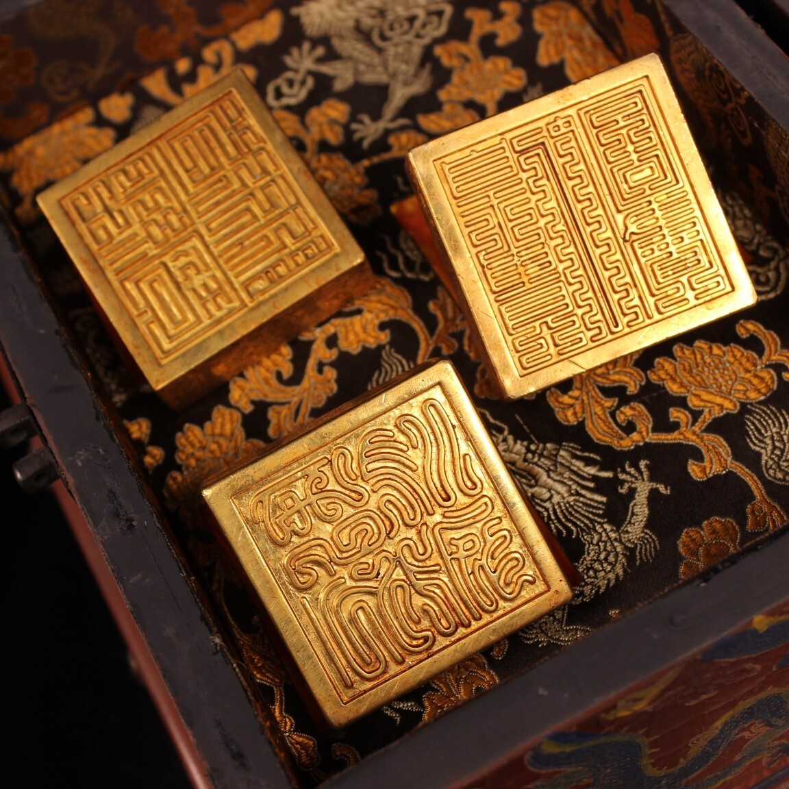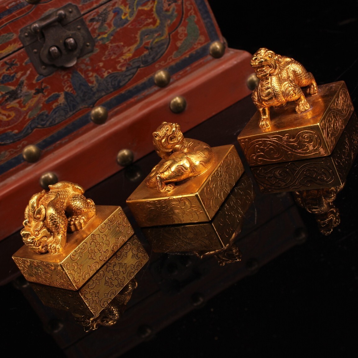 永し 清時代 古銅塗金 乾清宮藏 瑞獸鈕 印章 三點 文房具 漆盒 極細工 古銅彫 置物擺件 古美術品 時代物 古董品 収集 旧家蔵出 中国唐物 A6