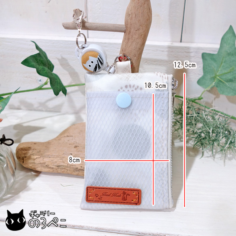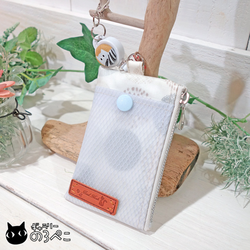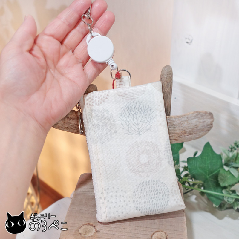 猫ちゃんリール付きのラミネートパスケース(北欧フラワーサークル柄オフホワイト・外ポケット付き) bc816-839
