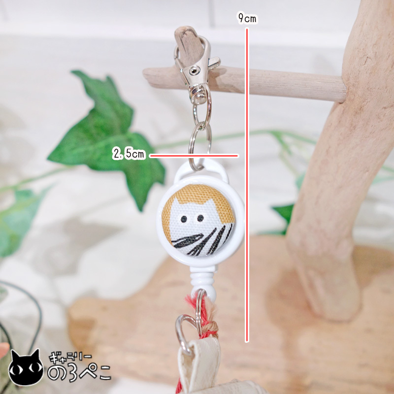 本体の入れ口はファスナーで、内側には思わずニッコリしてしまいそうな猫ちゃんのお顔いっぱいのコットン生地を使ってみました。約20cm伸びるコードリール付きです。コードリールにも猫ちゃん柄の生地でつくったくるみボタンを飾ってみました♪