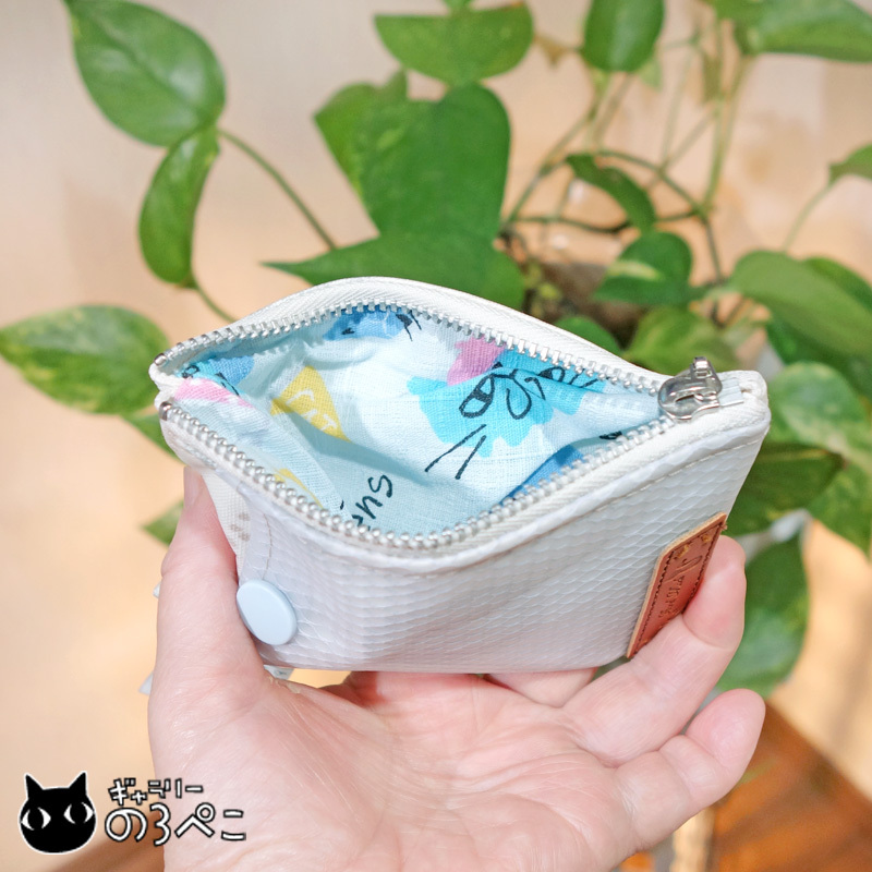 本体はオフホワイトのラミネート生地。こちらもビニールコーティングされた素材なので水や汚れに強いです。また、ラミネート生地は芯地を貼ったように張りがあるので、ヘナヘナ型崩れしたりせず、しっかりしていて扱いやすいです。