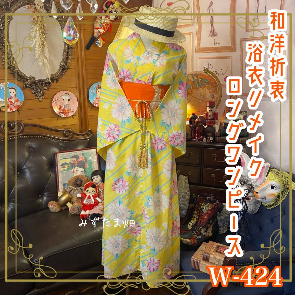 【 和洋折衷 浴衣 リメイク ワンピース ドレス 名古屋帯サッシュベルト 可愛い儚げパステル系 W-424 】