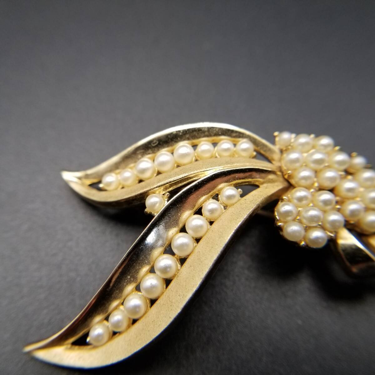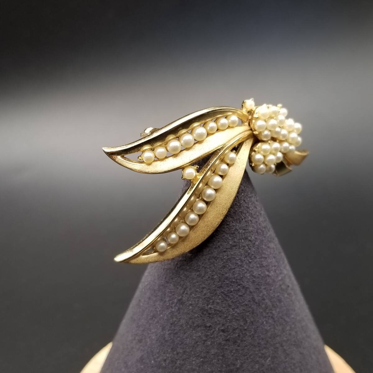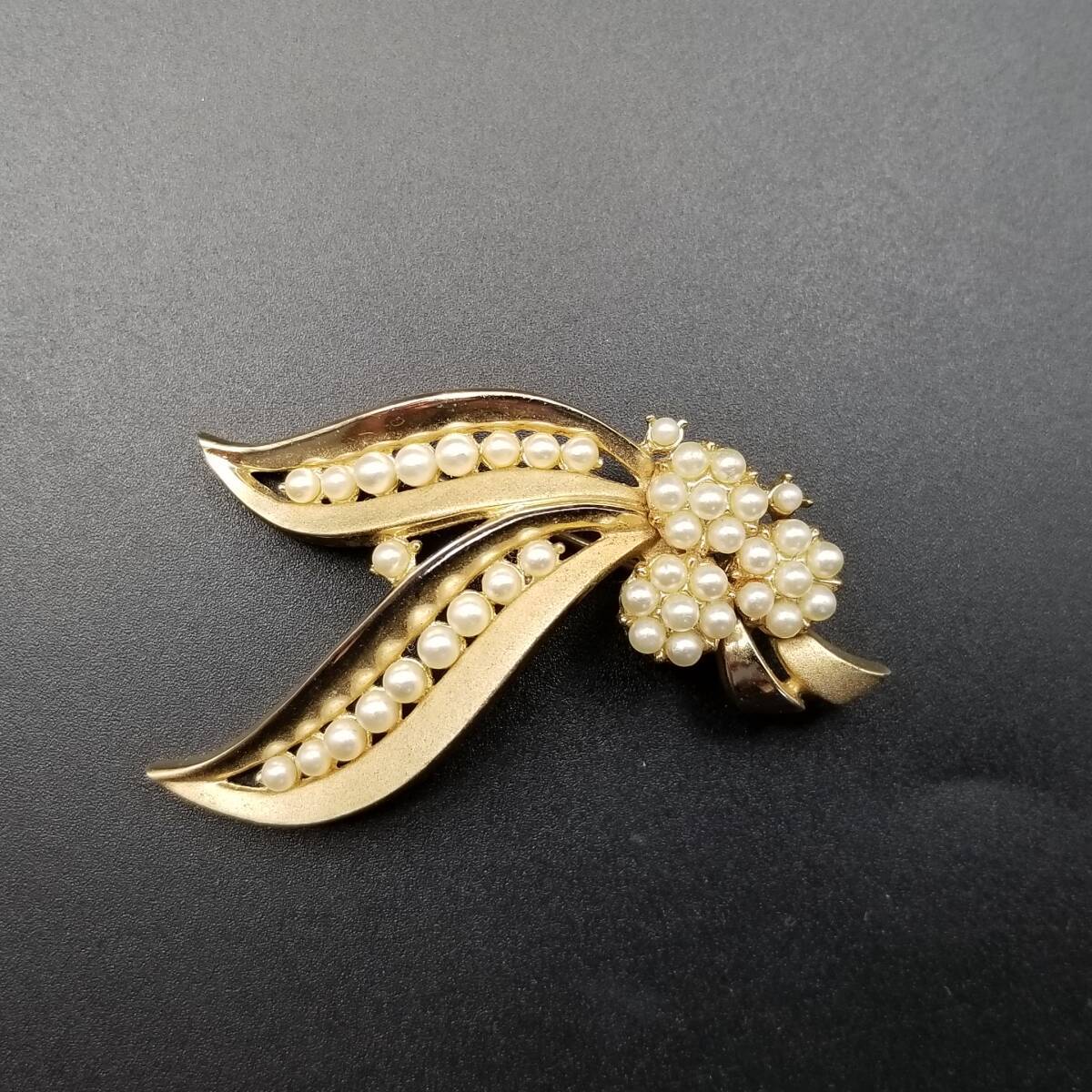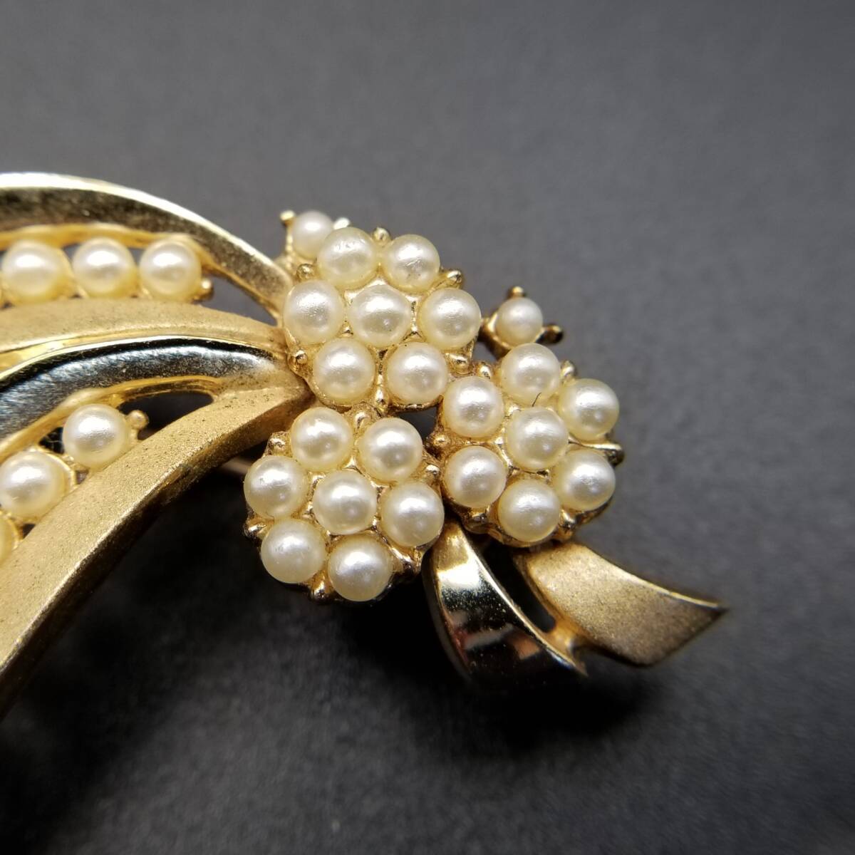 50'60's Crown TRIFARI 花束 植物モチーフ パール装飾 ヴィンテージ ブローチ ゴールドトーン 曲線美 エレガント フローラル Y17-W