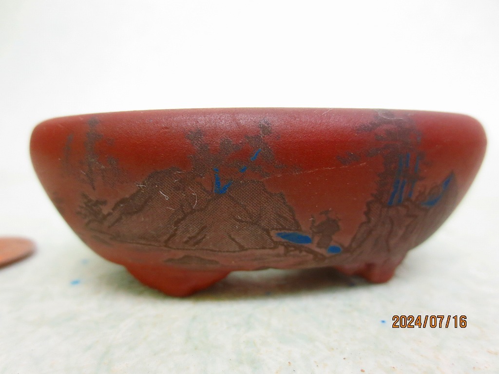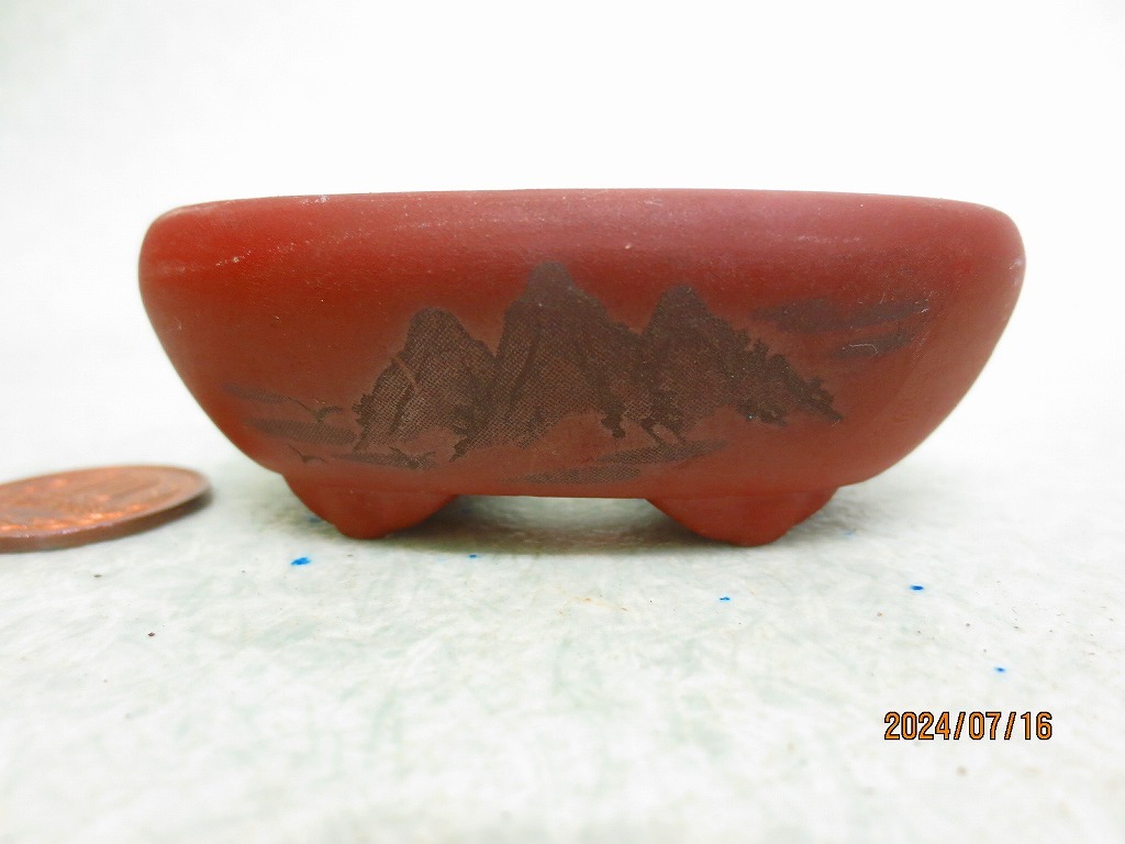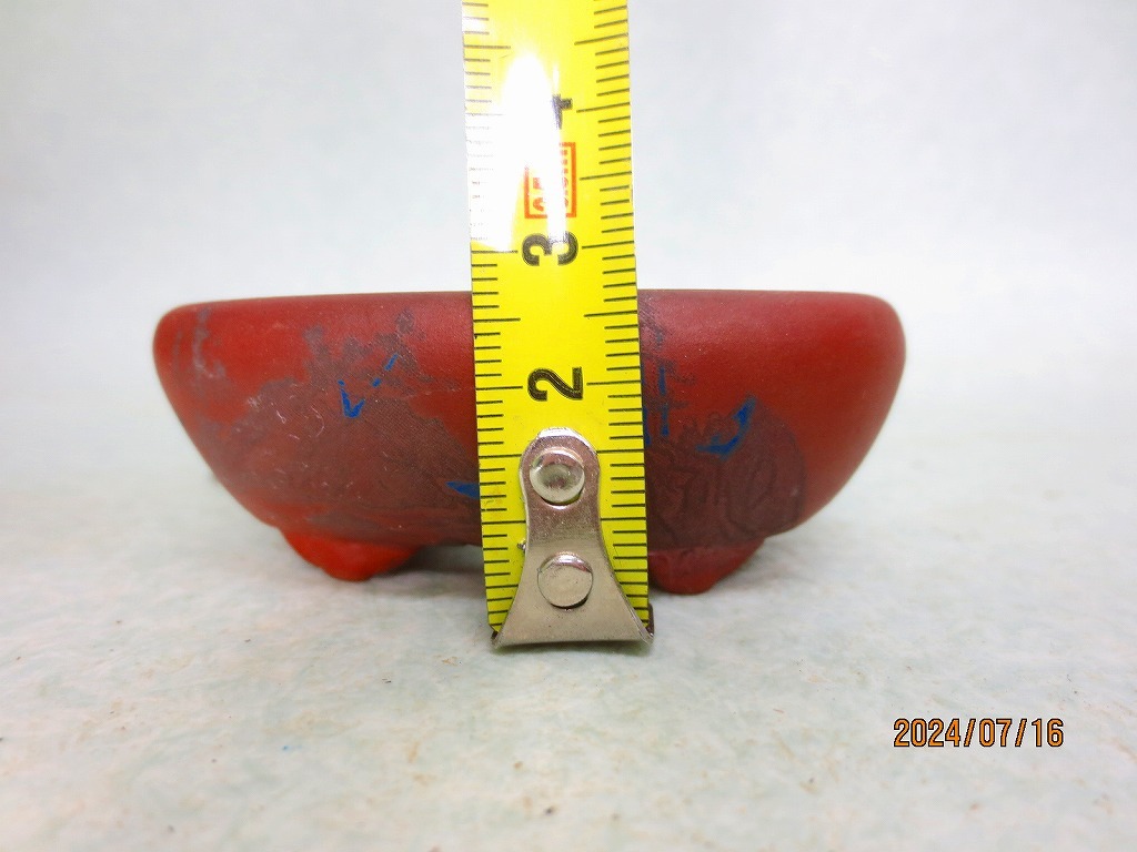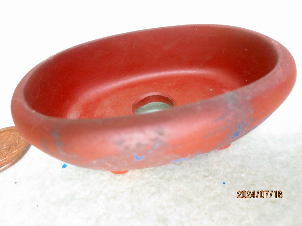[緑の市場] 小品盆栽鉢 銘あり 絵付朱泥楕円鉢 7.6㎝ (J084)送料無料/有料(ゆうパック)選択可※無料はメール便ポスト投函 ゆうメール便選択は送料無料で3㎝厚みの箱で発送します。(3㎝で入らない場合は定形外郵便で発送します。)ポスト投函ですから配送日時指定はできません。補償なしです。ゆうパック選択は送料有料で補償あります。複数点追加できます。*盆栽と同梱包ご希望の際は送料不要ですが別途取引メッセージでお知らせください。 ヤフオクの取引においてメッセージは特に必要ありません。挨拶などを省略できる取引システムですし取引ナビの通知で進行状況が判るので都度の連絡(送金や受け取りのメッセージ)は不要です。特別な連絡事項があればお知らせください。双方合理的に進めましょう。また、お急ぎの方は入札をご遠慮ください。業務時間内での対応になります(土日祝休業)。 寸法は一緒に撮影しているスケールまたは比較物をご参照ください。 飲料缶は高さ約10㎝、直径約5㎝です。 500mlペットボトルは高さ約21㎝です。 僅かなカスレ傷がある前提でお求めください。 画像(撮影時)では小細部まで表現できないので完璧品をお求めの方は入札ご遠慮ください。 |