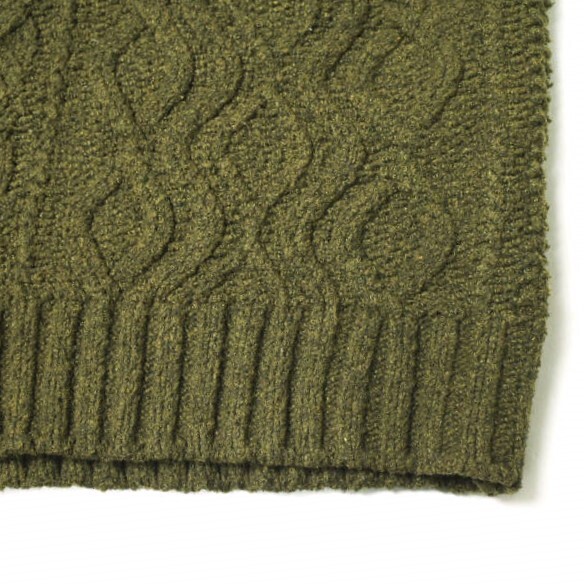 こちらはクラシックなARAN KNITを現代的な素材解釈でモダナイズさせた、ドライバーズニット。通常オイルを含んだ羊毛で編み立てられるARAN KNITを、環境に配慮したリサイクルポリエステル100%の起毛撚糸で製作。