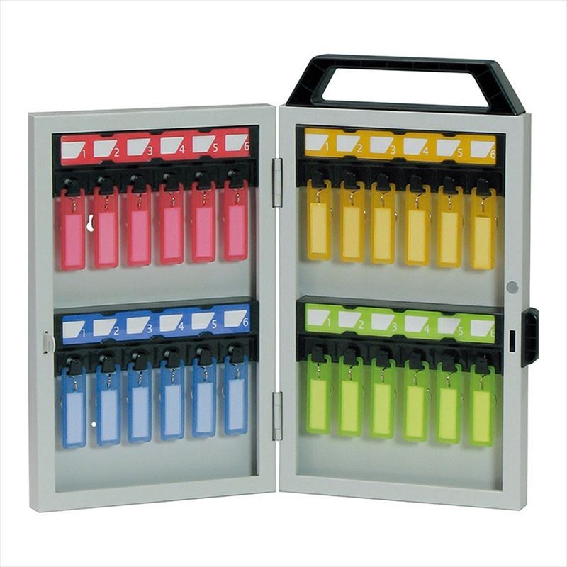 壁面に固定でき、取っ手付きで持ち運びも可能なキーボックスです。
