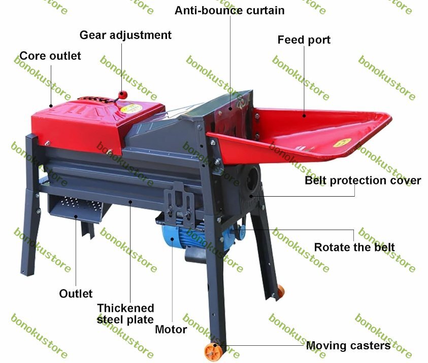【大口径供給口】:供給口の直径を大きくすることで、一度に複数のトウモロコシを置くことができます。脱穀機はトウモロコシのサイズに応じて適切なギアを調整することができ、トウモロコシの脱穀速度が大幅に向上します(ドライトウモロコシの脱穀効果が最高です)。