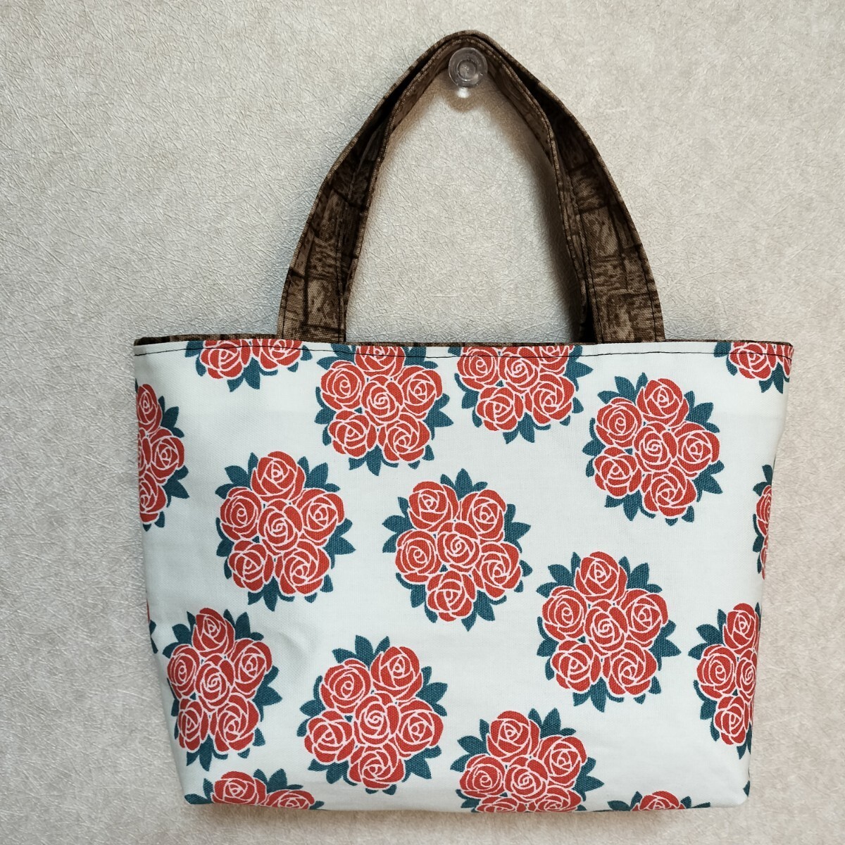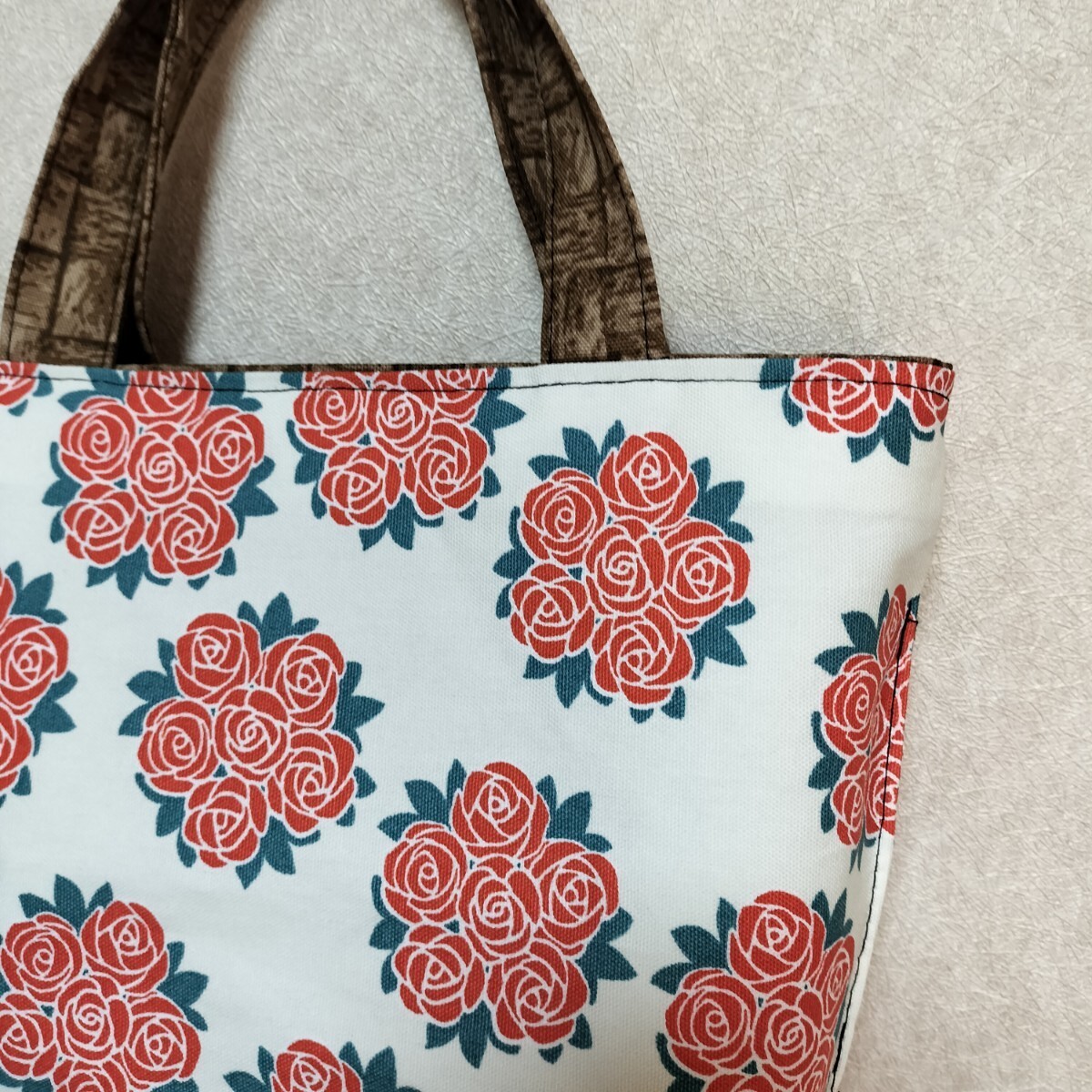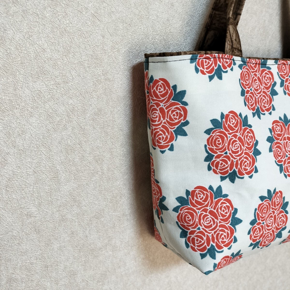 リバーシブルばら柄カゴ柄のトートバッグです。ちょっとしたお出かけ、お散歩バッグ、お弁当バッグ、手提げバッグなどにいかがでしょうか。