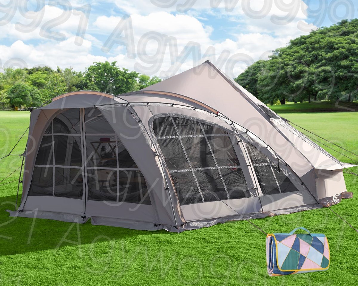 [リビングルームとベッドルームの2ルームファミリーテント]は、トンネルアウタールームとベルテントベッドルームの2つの部分で構成されています。内側のテントは取り外し可能な吊り下げタイプで、使いやすいです。 ベッドルームエリアのサイズは約238 x 300cmで、2~4人を快適に収容できます。 外側のリビングルームは、通常のトンネルテントよりも長く、幅が広いです。 基本的にテーブル、椅子、棚などを置くことができるので、小型車であればテールゲートテントとしても使えます。 ペットのいるご家族にも最適です。