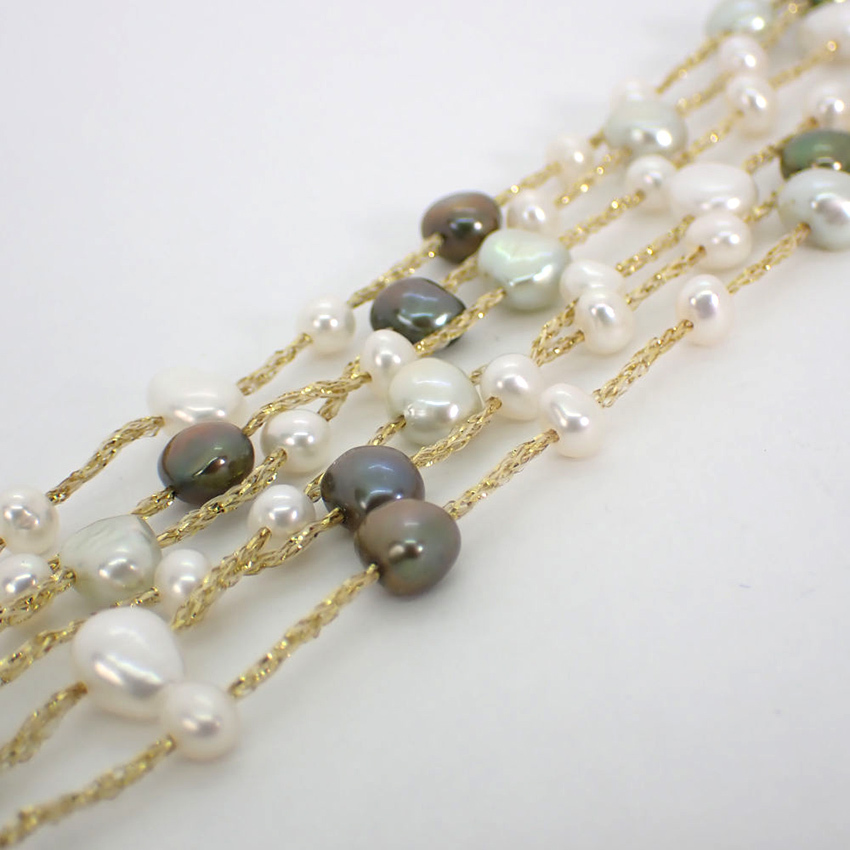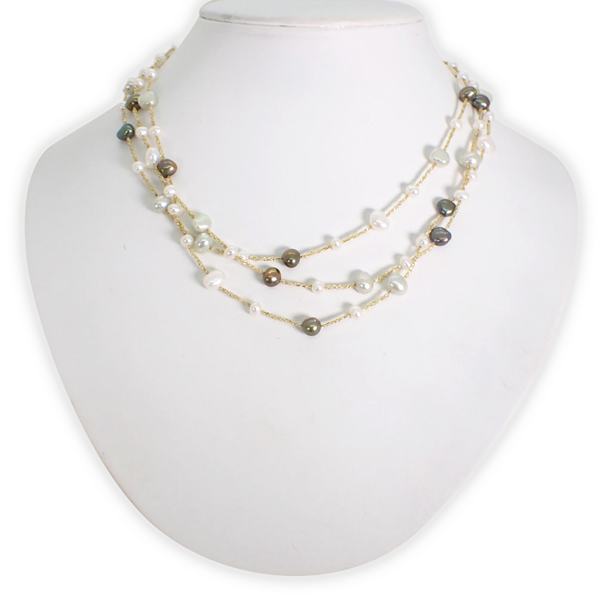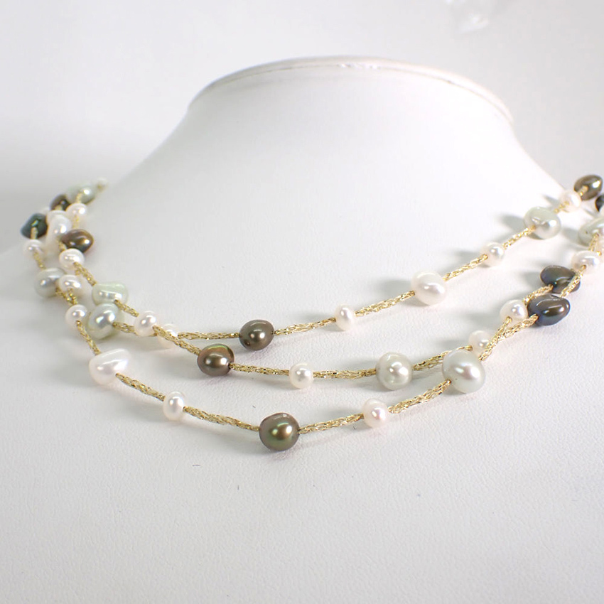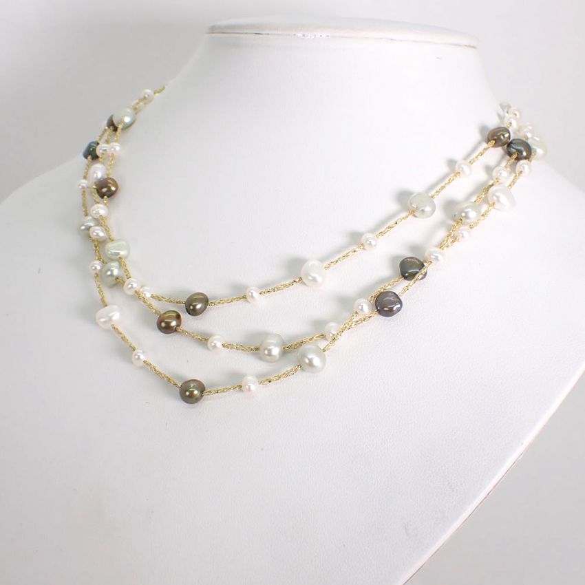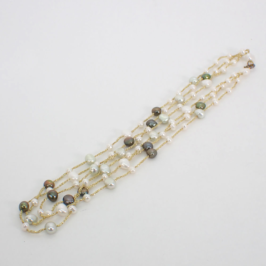 淡水真珠/マルチカラーのパールをステーション状に並べた三連パールネックレスです。