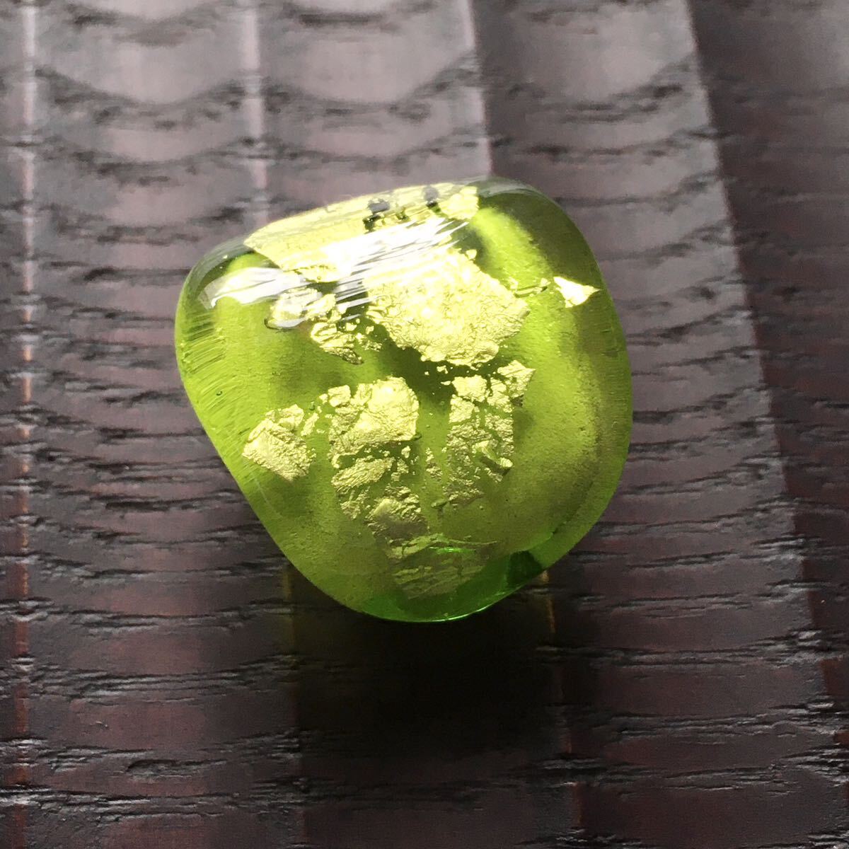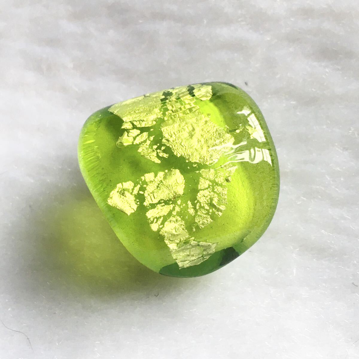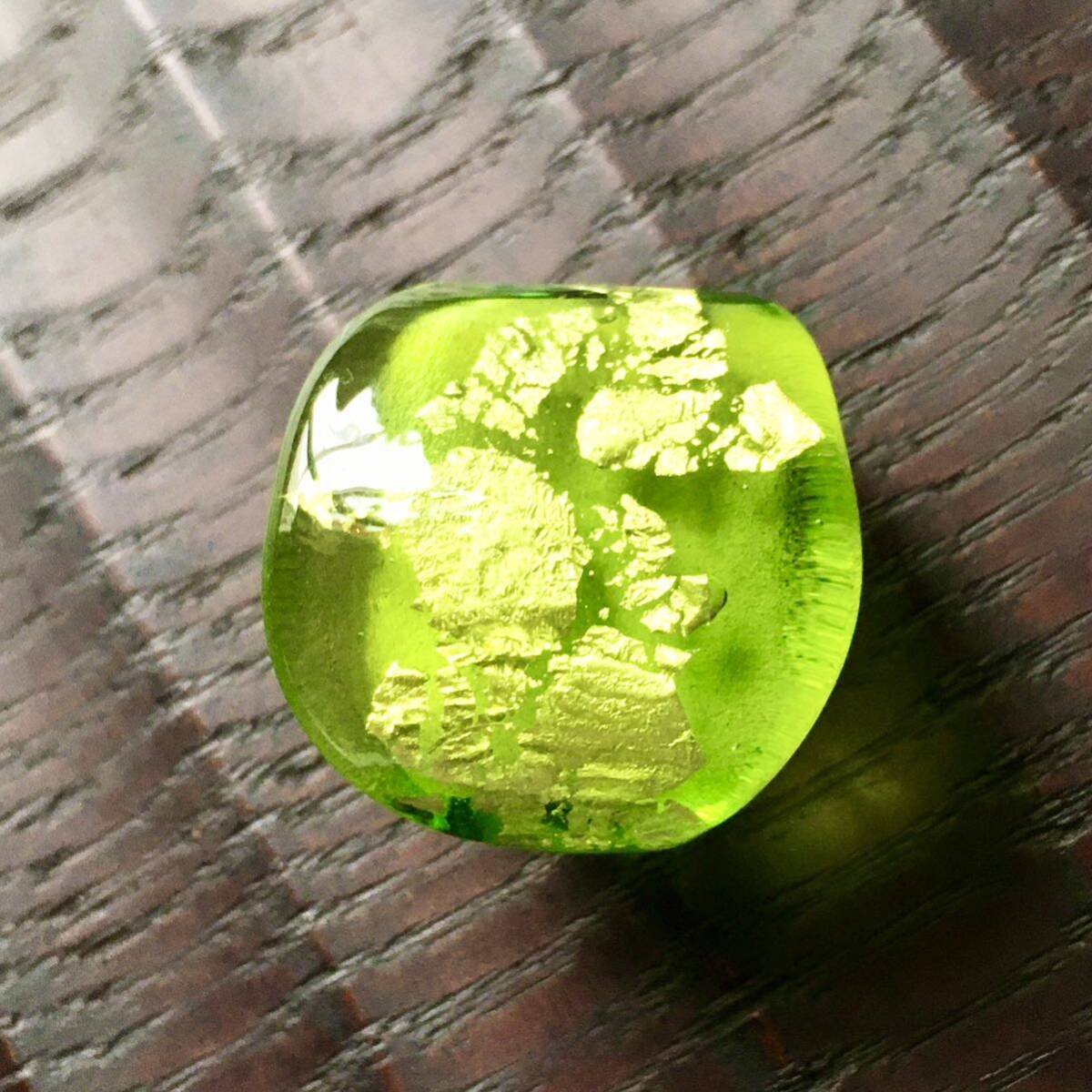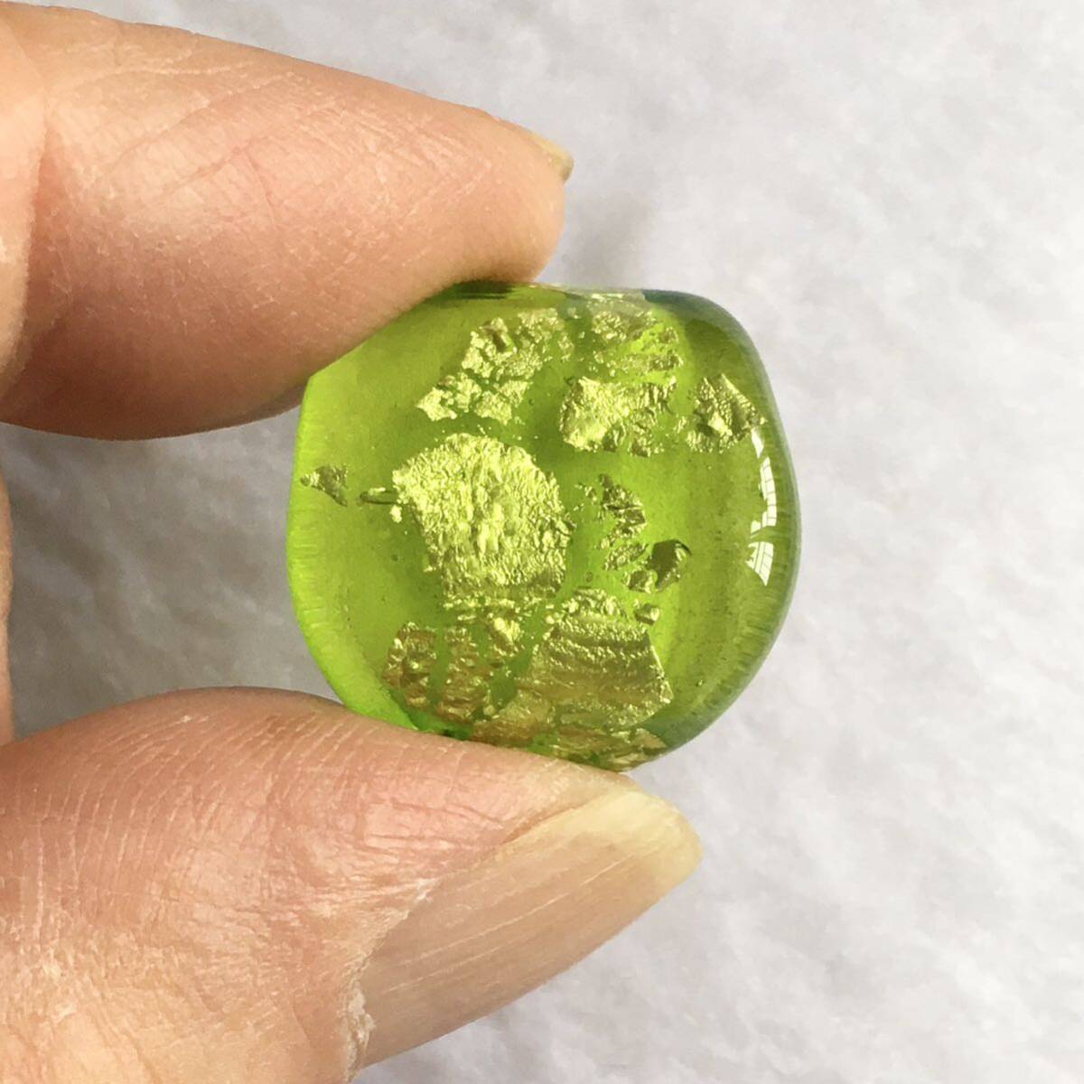ガラスは二層になっていて、黄緑色のガラスの表面に銀箔を貼り合わせ、その上からさらに黄緑色のガラスを被せています。
