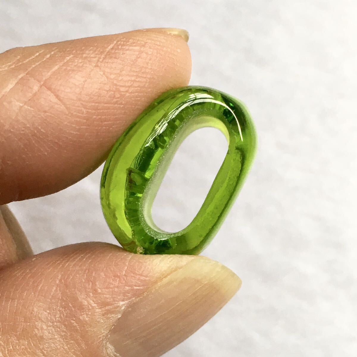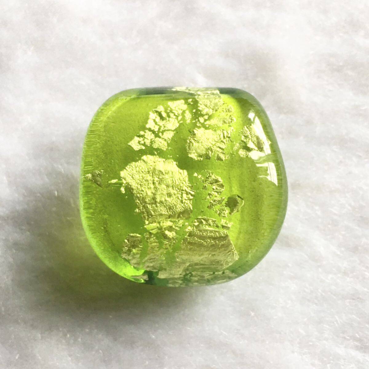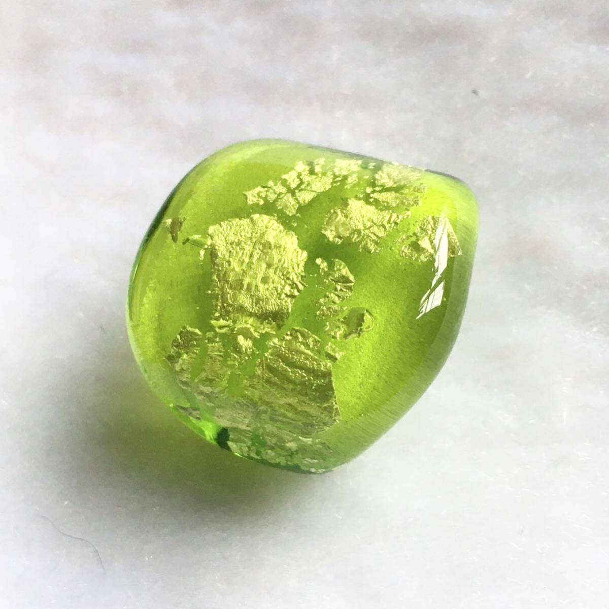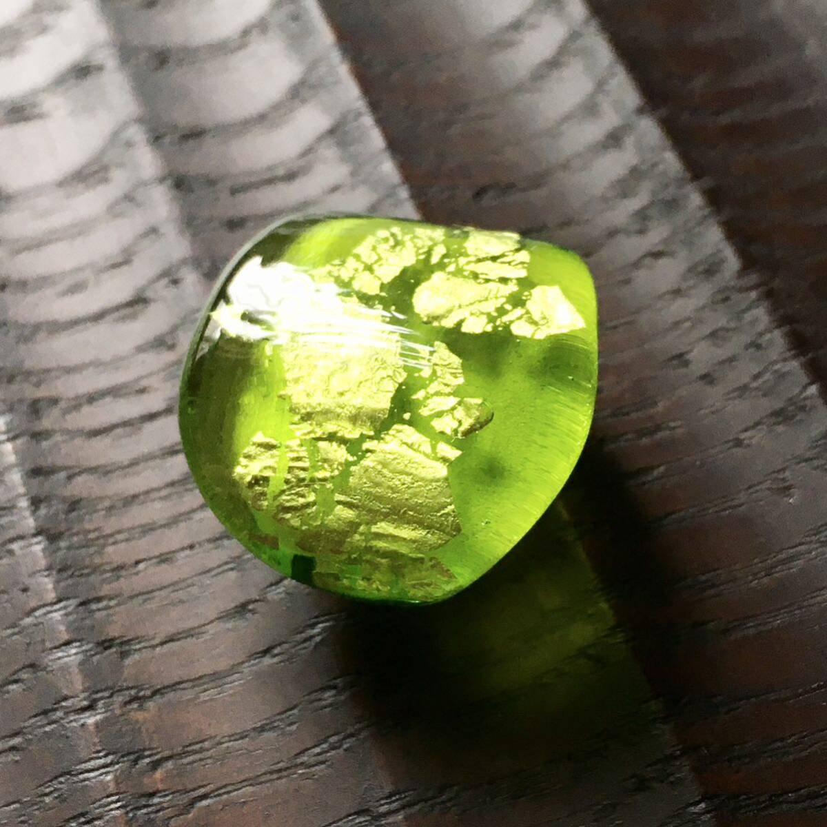 ガラスは二層になっていて、黄緑色のガラスの表面に銀箔を貼り合わせ、その上からさらに黄緑色のガラスを被せています。