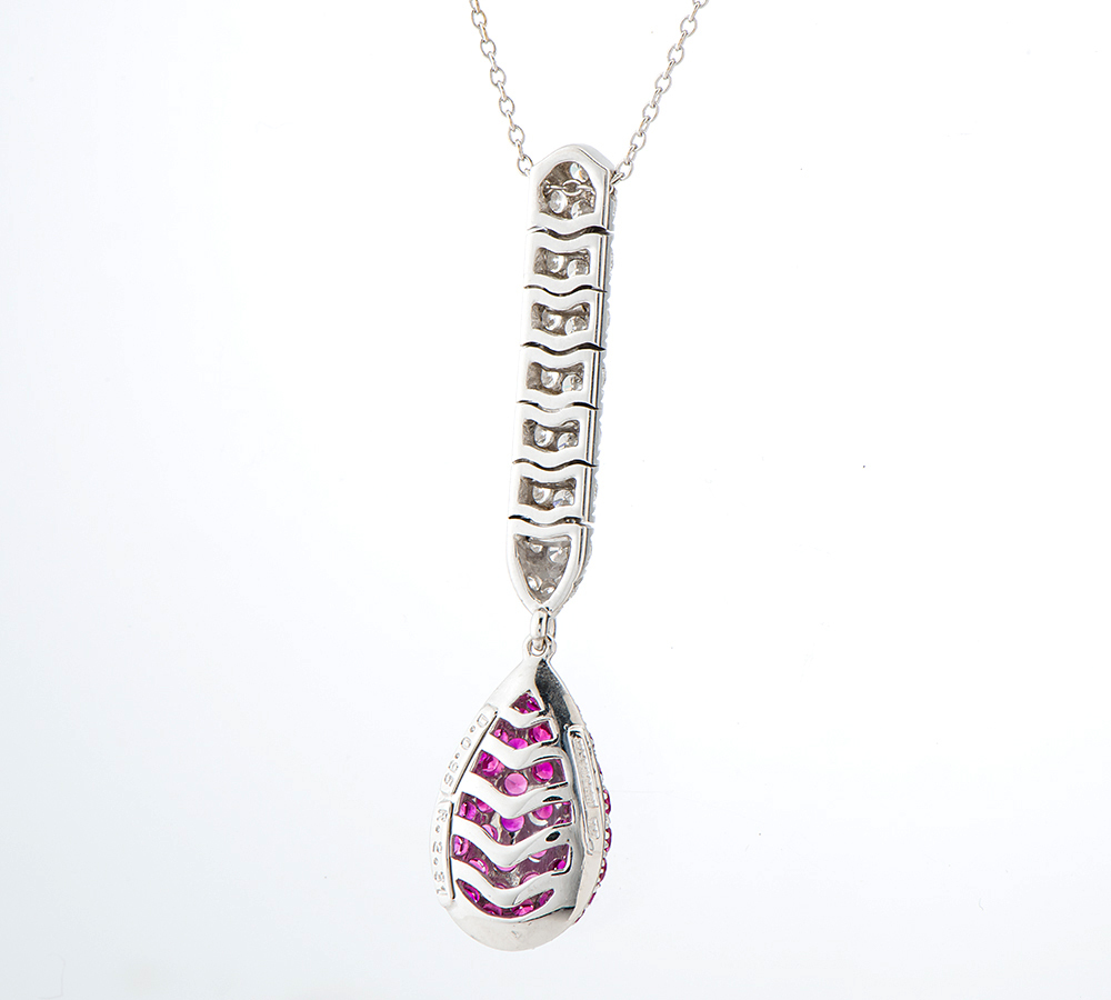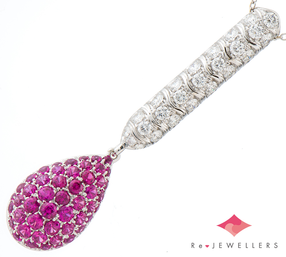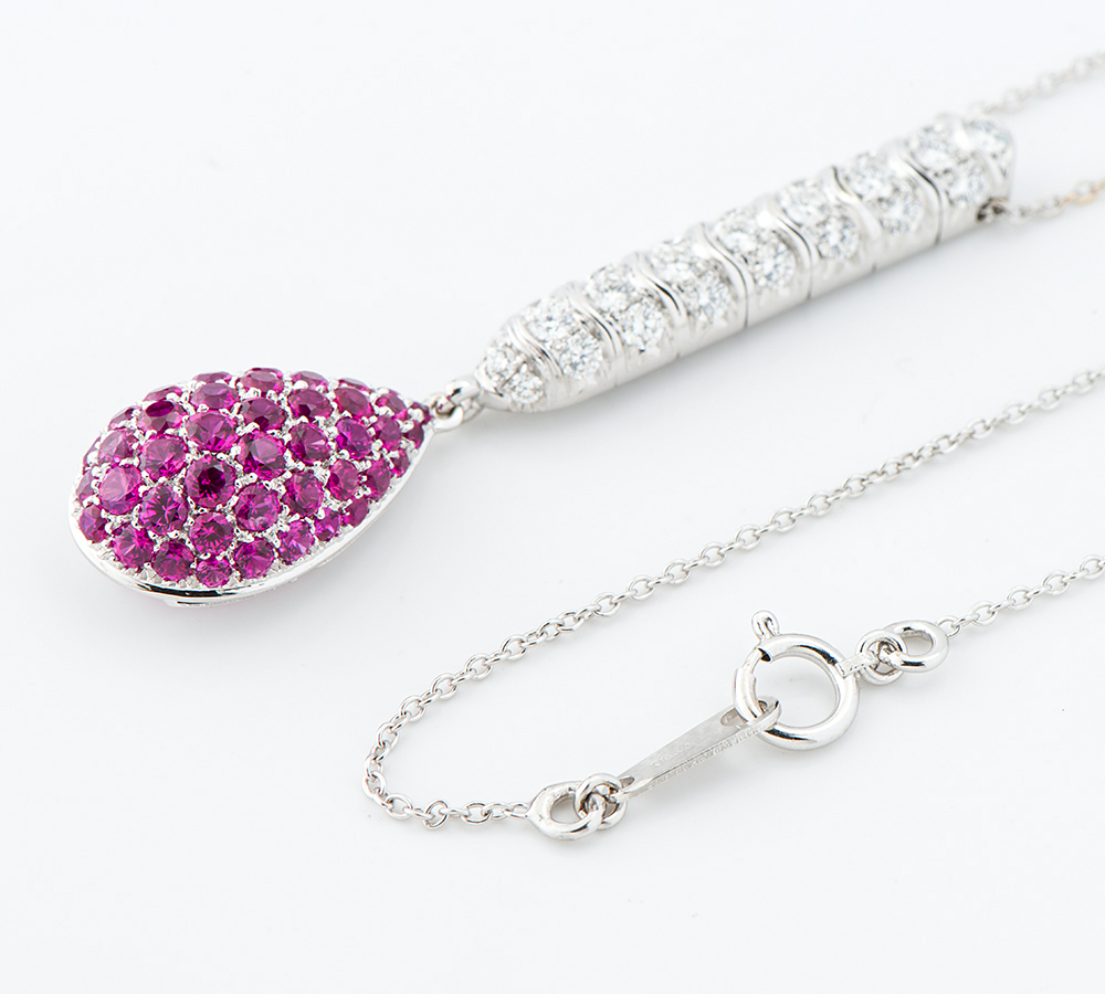 1967年ジュゼッペ・ピキョッティが創立。「イタリア ヴァレンツアの至宝」と称えられる各国王室の御用達ブランド PICCHIOTTI(ピキョッティ)。ルビーの鮮やかな赤とダイヤモンドのコントラストが美しいペンダント ネックレスです。ホワイトゴールドの光沢とダイヤモンドの輝きが目を引く縦のラインから鮮やかなルビー計2.31ctは雫型の中に滑らかにセッティングされ、非常に美しく独特なデザインをより際立たせています。大ぶりなサイズ感が華やかな印象を与える個性的なジュエリーです。