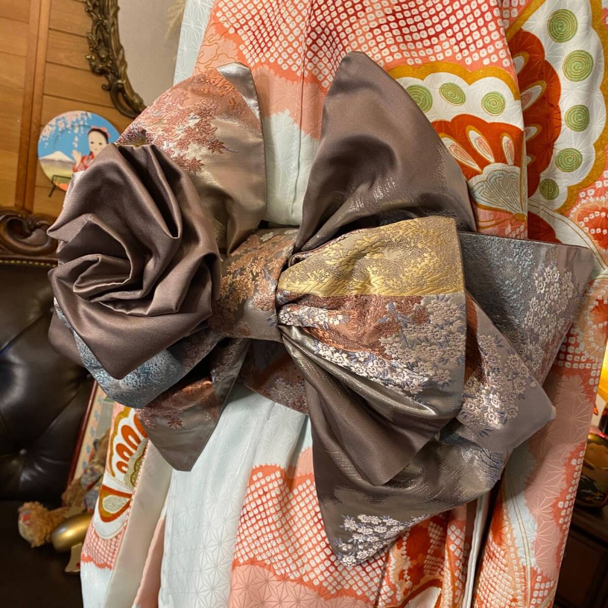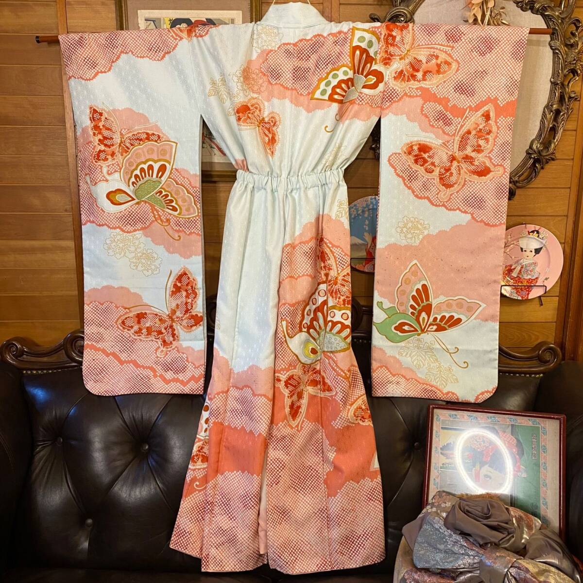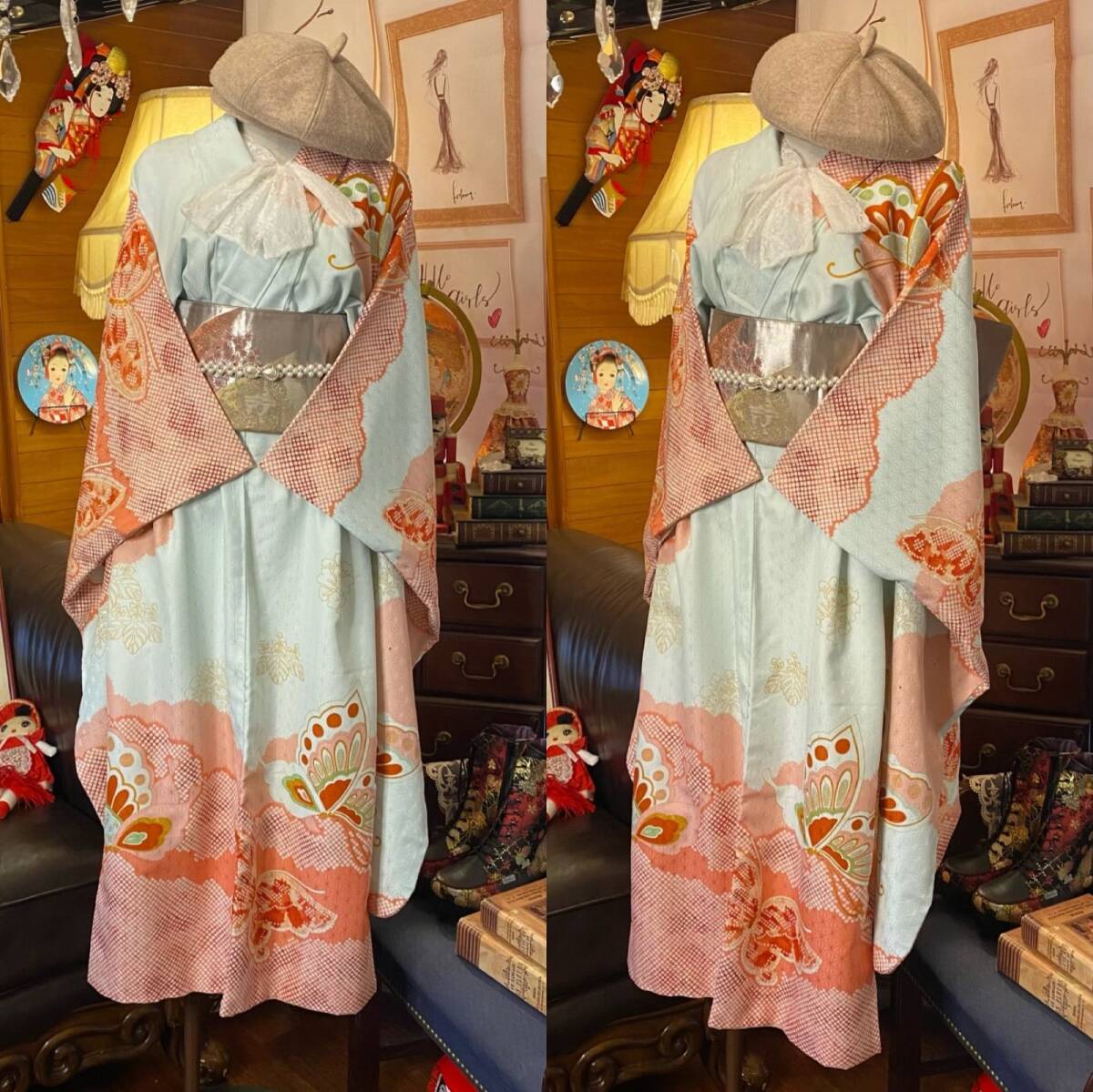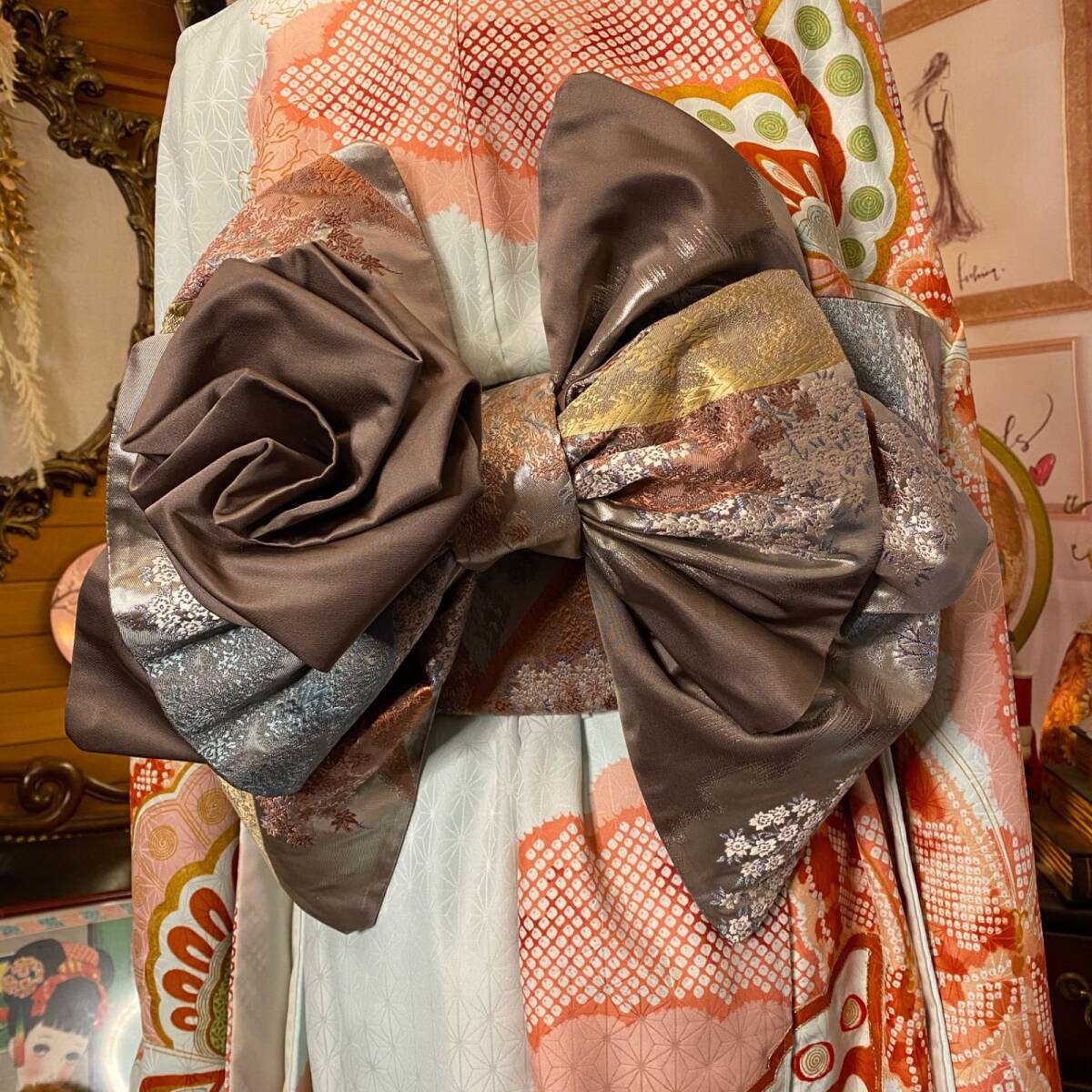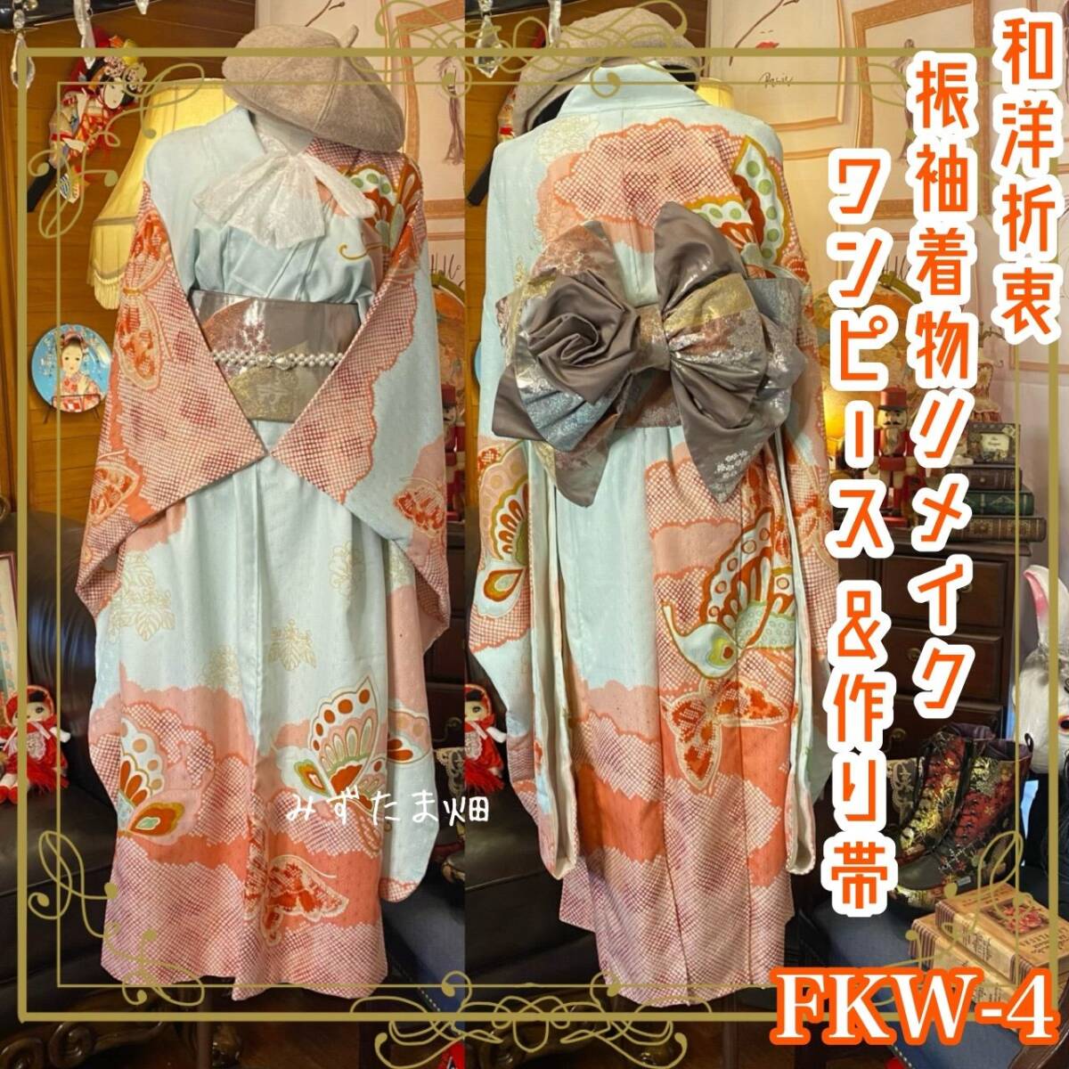 【 和洋折衷 振袖 着物 ワンピース ドレス 2部式作り帯 リメイク 和 モダン ハンドメイド レトロ 古着 FKW-4 】