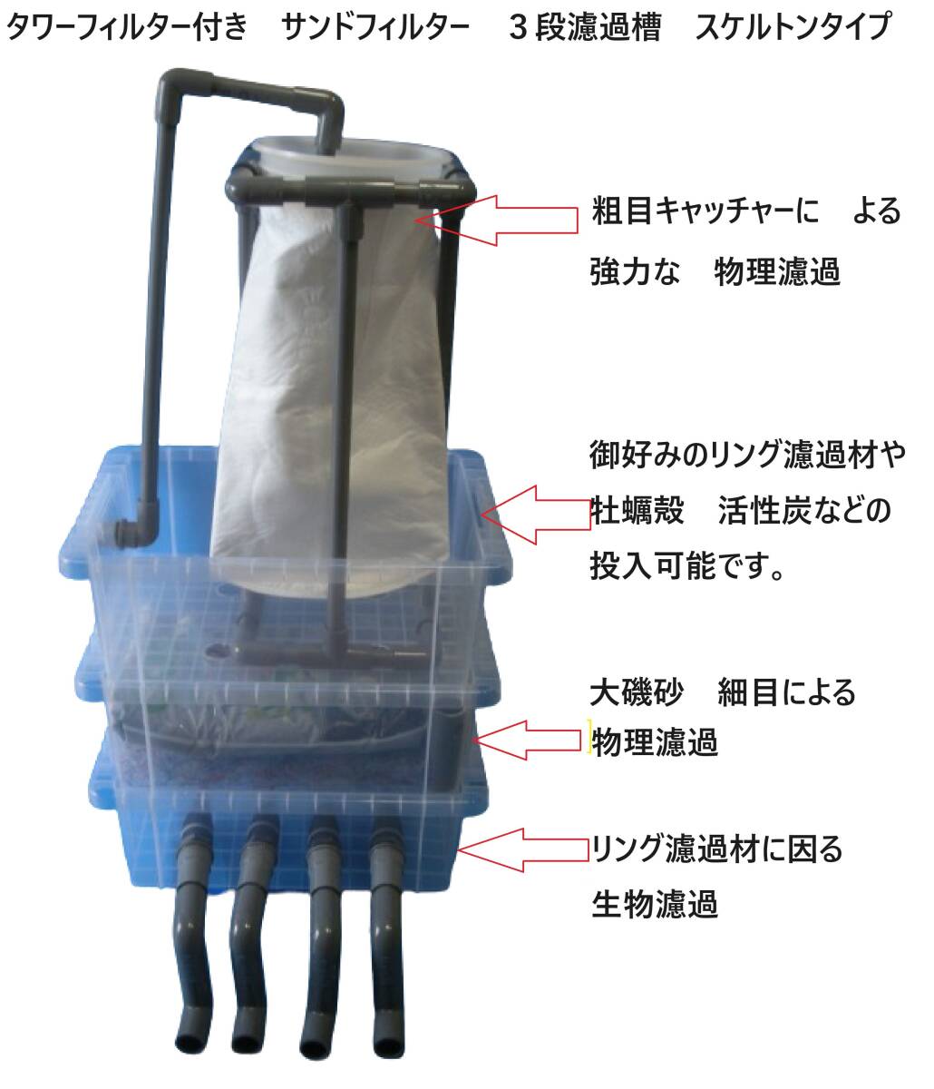 タワーフィルター付き サンドフィルター対応 2段濾過槽  スケルトンタイプは 4個口(写真参照)で