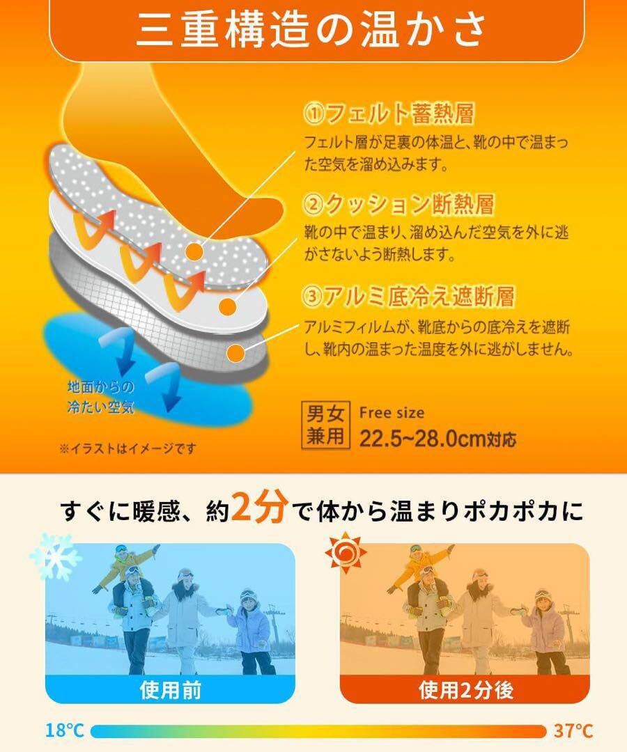 インソールの表面は、天然の羊毛を使用しており(最大厚さ1.2cm)、瞬時に温かさを感じさせ、約2分で体が暖かくなるため、快適さを実感できます。羊毛は特別な処理を受け、においを取り除いており、足のにおいの発生を防ぎ、日常生活でも安心してご使用いただけます。(*わずかな毛が浮くことがありますが、これは正常な現象で、簡単に取り除けます!)