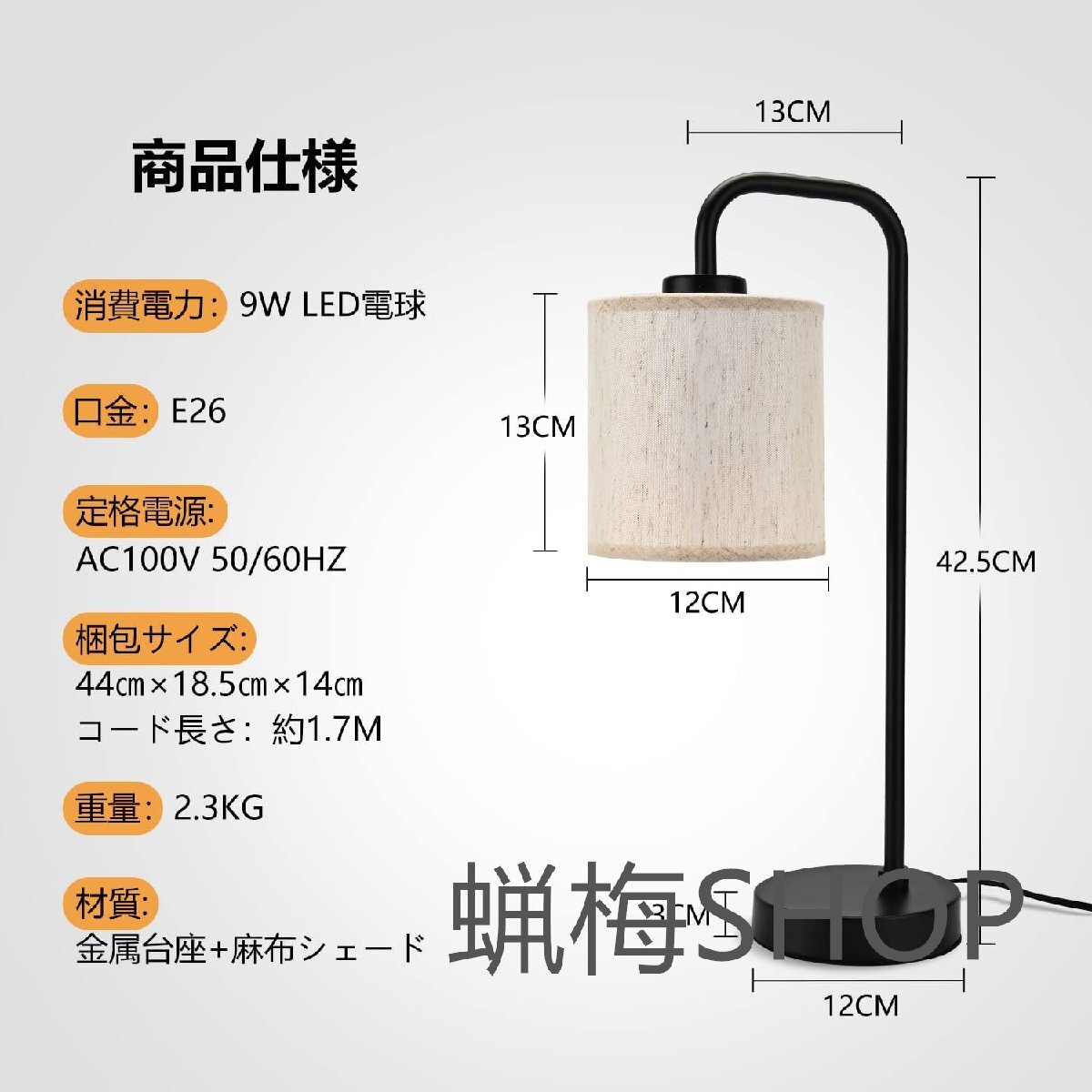 サイズ:全体高さ42cm 、ベース直径12cm、素材:金属ベース+布シェード、口金:E26 (電球は含まれておりません)、商品内容:本体+電源線(押しボタンスイッチ )口金:E26(LED電球付属)