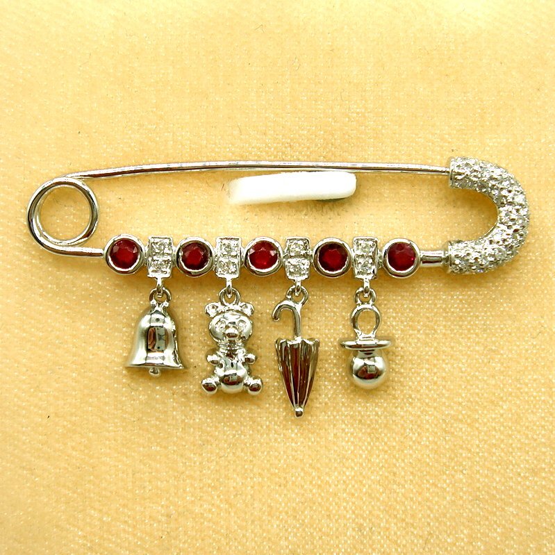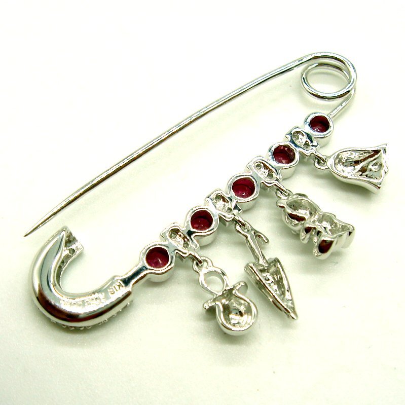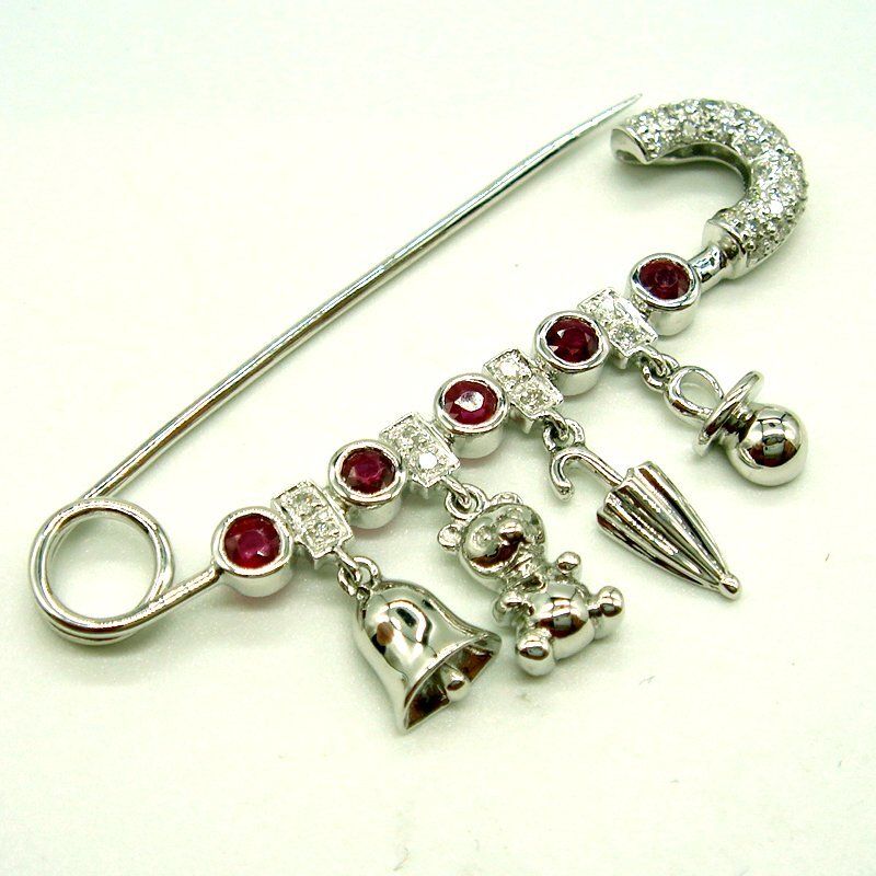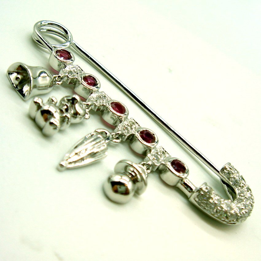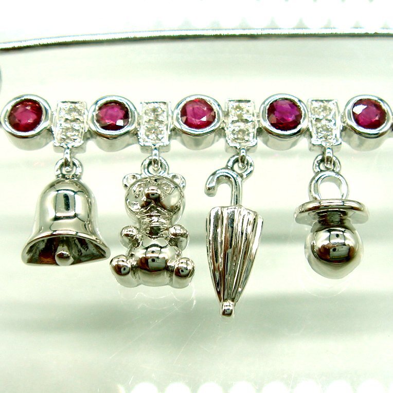 大粒ルビー5pcsの間にダイヤが留まった四角いパーツを配置し、それぞれのダイヤパーツの下にベル・テディベア・傘・おしゃぶりがぶら下がっています。