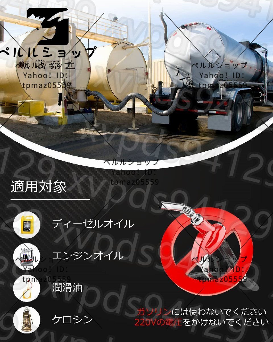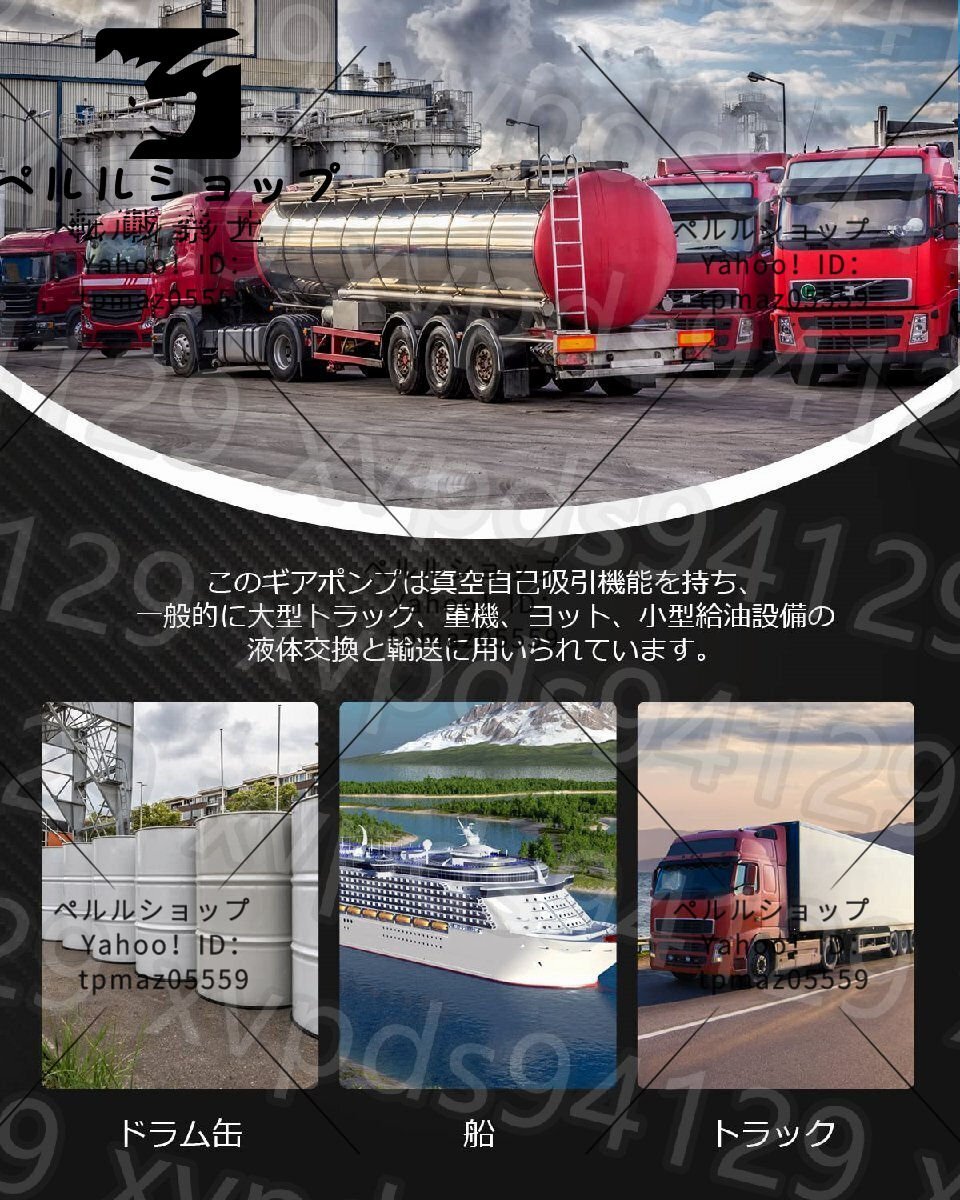 【オイル交換・運送】このギアポンプは真空自己吸引機能を持ち、一般的に大型トラック、重機、ヨット、小型給油設備のオイル交換と輸送に用いられ、ディーゼルオイル、エンジンオイル、潤滑油、ケロシンなどの高粘度油性液体を対象としています。〈注意〉ガソリンと石油燃料には使えません。