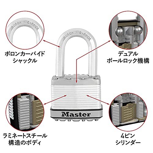 「Master Lock (マスターロック) 南京錠 鍵式 プロ仕様 防錆 屋外 カバー付 ハイセキュリティ 本体幅48mm 吊高内径38mm 防」▼71649281426▼(商品説明)南京錠 鍵式・ブラック 本体幅: 51mm M115JADLF・サイズ:(本体)幅48mm(シャックル)太さ8mm、内径幅21×高さ38mm・質量:239グラム(鍵抜き)・付属品:鍵4本・屋外での使用に適したカバー付・シャックル素材:切断に対して焼入れ鋼に比べ50%UPの強度を誇る超硬素材ボロンカーバイド(炭化ホウ素)説明 圧倒的なセキュリティ性能を備えたプロ仕様。 超硬素材ボロンカーバイド採用のシャックル(ツル)で、過酷な条件下でも万全。 ボロンカーバイド(炭化ホウ素)とは、モース硬度14(ダイヤモンドが最高の15)の非常に硬い素材。 八角形のシャックルはボロンカーバイド採用で、切断への耐性が通常シャックルの2倍。 倉庫、車庫、立ち入り禁止区域のフェンスの施錠などに。