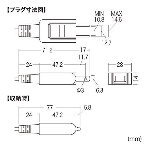 「サンワサプライメガネ型コネクタ対応電源コード(5m)KB-DM2S12A-5」▼4969887826249▼(商品説明)・ブラック 5m KB-DM2S12A-5・・Size:5m・トラッキング火災予防絶縁キャップが付いた安全なプラグ収納型電源コードです。プラグが収納されているので、持ち運びにも便利です。・各社ノートパソコン、周辺機器などのACアダプタ用電源ケーブルとして使用できます。・原産国:中国・ブランド:サンワサプライ説明 ●トラッキング火災予防絶縁キャップが付いた安全なプラグ収納型電源コードです。プラグが収納されているので、持ち運びにも便利です。 ●各社ノートパソコン、周辺機器などのACアダプタ用電源ケーブルとして使用できます。 ■カラー:ブラック ■定格容量:125V 12A(最大1200Wまで使用可能) ■プラグ仕様:ACインレット(メガネ型)・2Pオス(絶縁キャップ付きプラグ収納式スイングプラグ) ■コード導体サイズ:1.5平方ミリメートル・HVFF ■コード仕上り外形寸法:4.2×7.6mm ■電源コード長:5m ■使用地域:日本国内のみ。日本以外ではご使用いただけません。 ■適合規格:電気用品安全法(PSE)技術基準適合品
